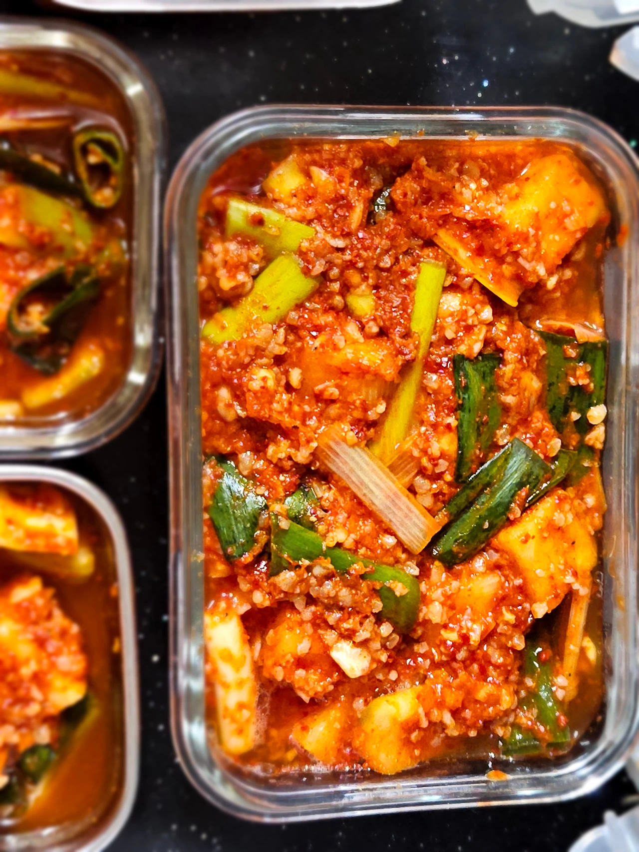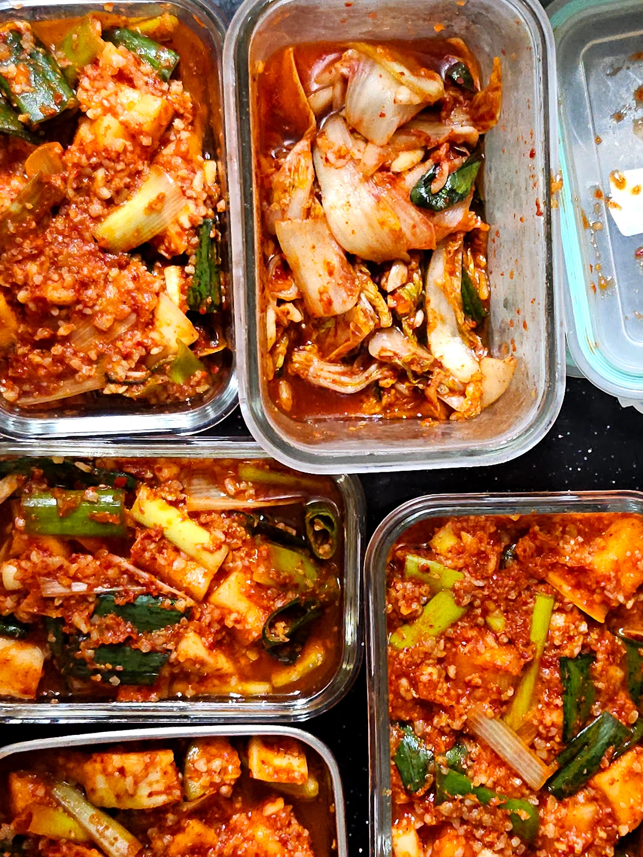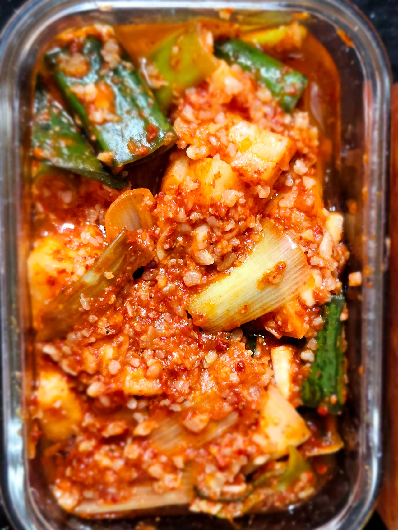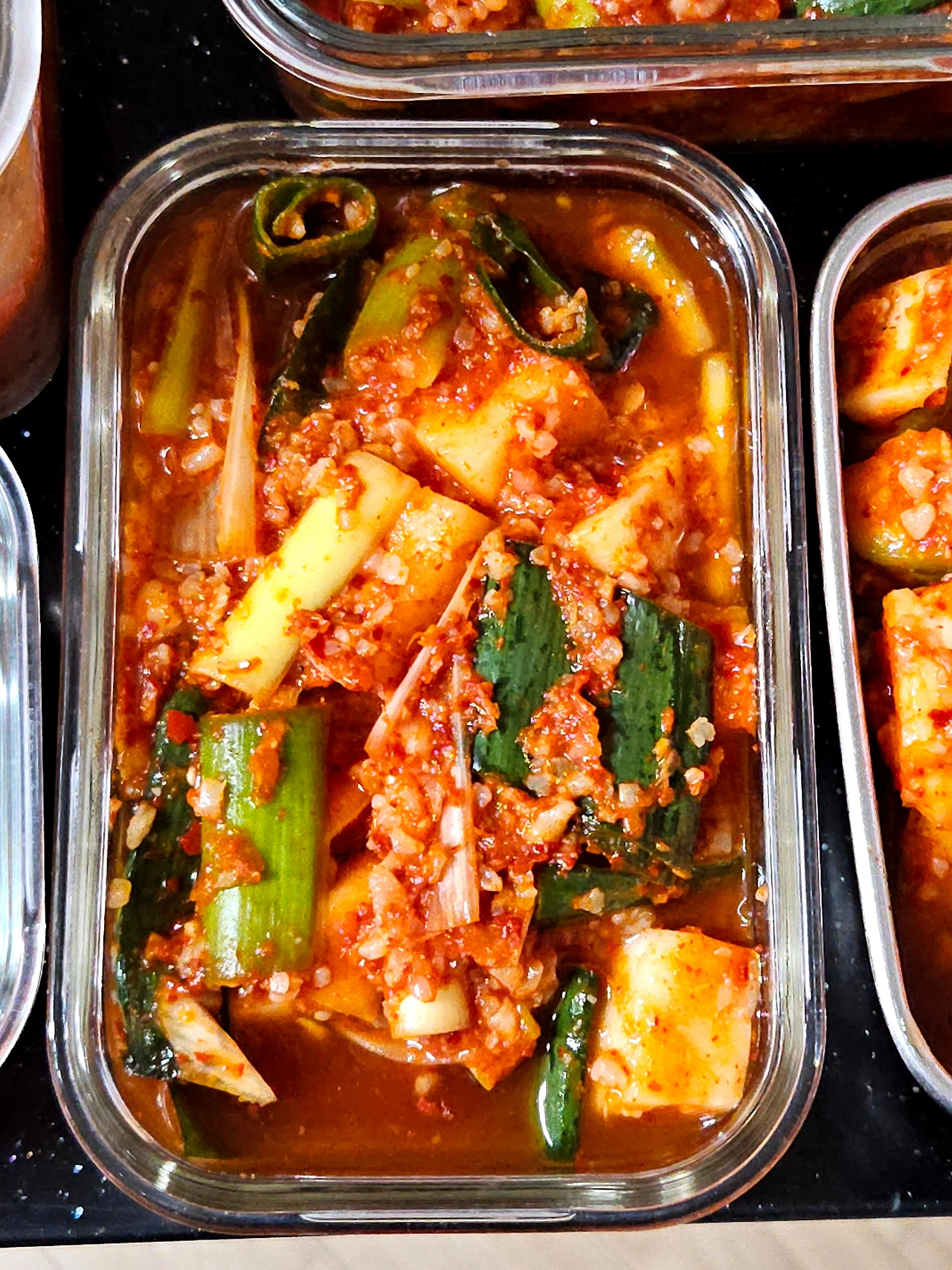 마땅히 커다란 김치 통이 딱 없어서 작은 밀폐용기를 꺼내서 깍두기며 배추 겉절이며 덜어서 담아 놓았거든요 김치 뚜껑을 열어보니 하루 사이에 금세 김칫 국물이 자박자박하게 생겼어요