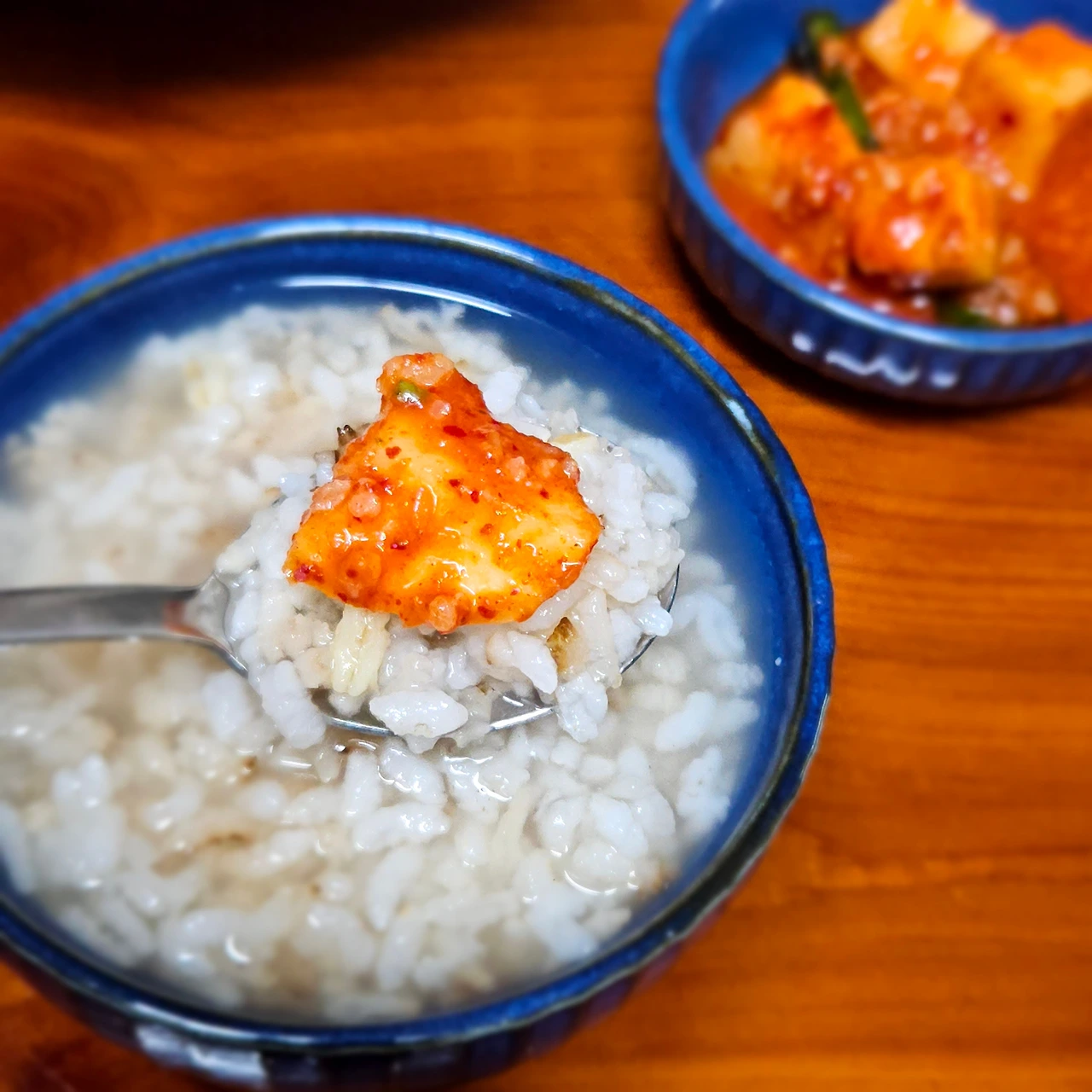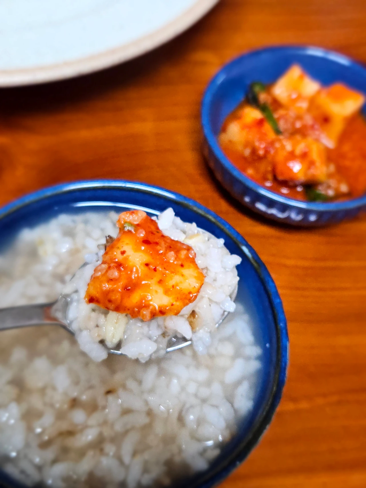 밥 숟가락 한 개를 들고 김칫 국물을 위에 끼얹어주면서 뒤적뒤적해 줍니다 겨울 저장무라서 무가 달고 맛있어요
