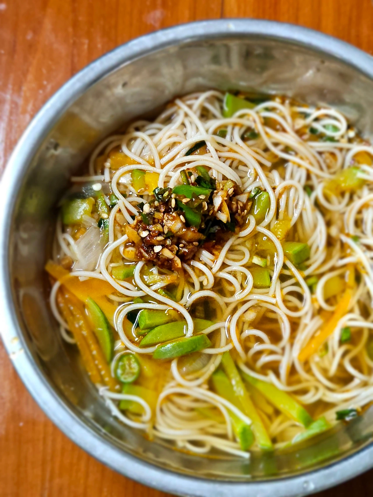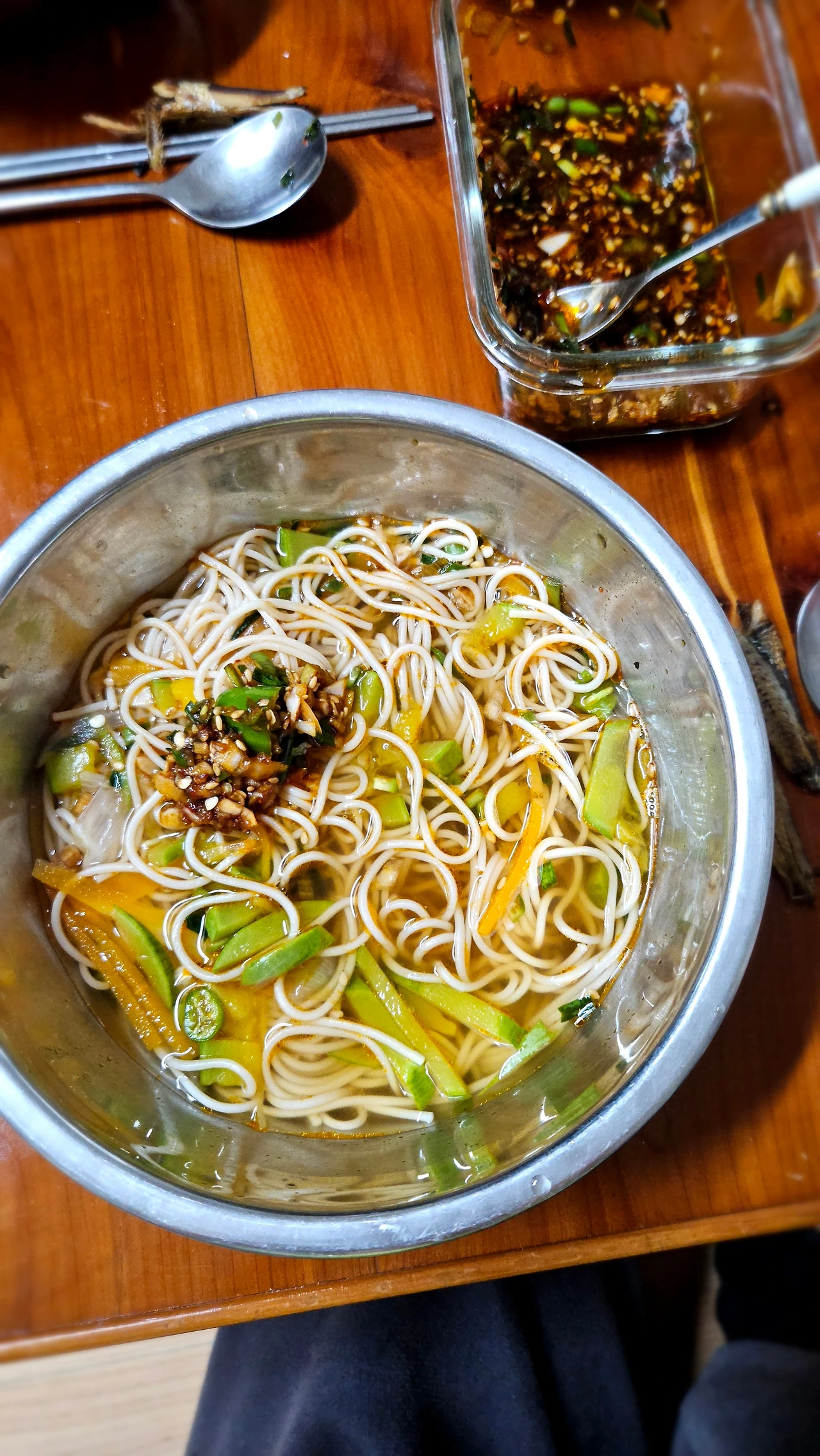 "지난번에 만들어 먹고 남은 간장 양념 있지 그거 꺼내와 봐" 국수에 곁들일 간장 양념에 청양고추 대파 등등 잘게 썰어서 넣고 간장 양념을 만들었다 바글바글 끓고 있는 냄비에 채 썬 호박 당근을 넣고 송송 썬 대파도 마무리로 넣어주었다 국물 간을 보면서 남편이 부족한 국물 간을 추가로 했다이것저것 뒷정리 정돈하고 나니 나는 제일 꼴찌로 국수를 먹게 되었다 아이들은 국수 먹고 얼른 놀이터에 나가고 싶은 마음에 부지런히 국수를 호로록 하면서 잘도 먹었다