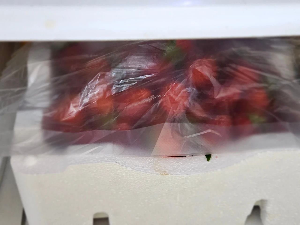 골라낸 싱싱한 상태의 딸기 비닐 뚜껑 살짝 씌워서 냉장고에 보관하기 며 칠 동안 싱싱하게 잘 유지되었다