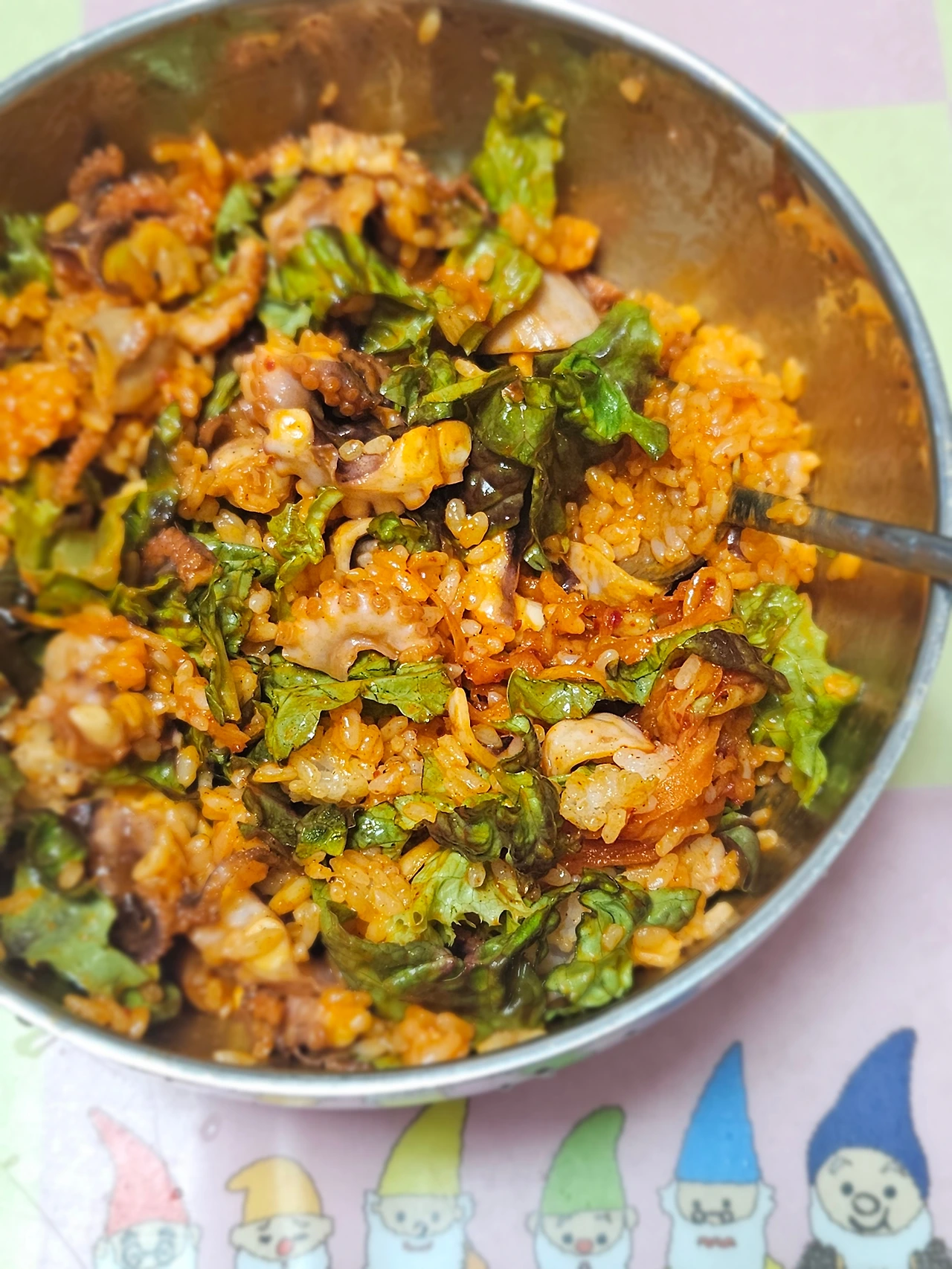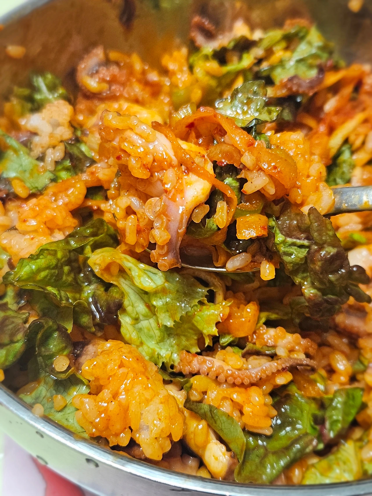 집에 와서 짐 정리해 놓고 감자를 삶았다 뜨끈뜨끈한 삶은 감자 한 개 맛있게 먹고 점심으로 쭈꾸미비빔밥 해 먹어야지! 하며 냉동실에 쭈꾸미를 꺼내서 끓는 물에 데쳐내었다 양푼에 밥, 주꾸미, 초장, 들기름 넣고 무채김치 넣고 상추 잘게 썰어서 넣었다 쓱쓱 비벼서 맛있게 먹었다
