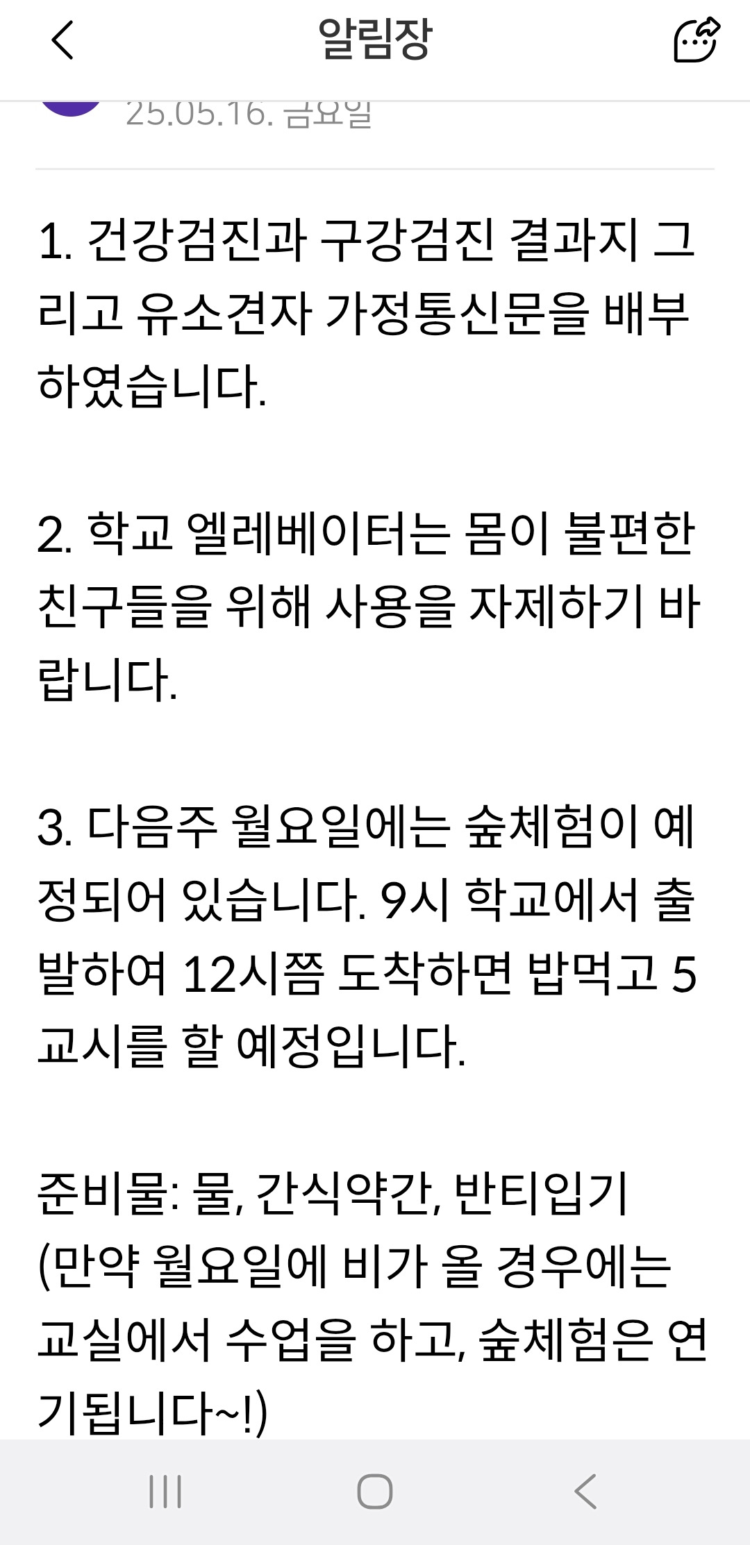 우리 집 초4학년 막내 아이는 어젯밤 잠들 때 오늘 아침 일찍 학교 숲체험 가야 해서 늦지 않게 등교를 해야 한다며 입고 갈 반티셔츠와 바지를 미리 다 입고 잘 거라고 등교할 옷으로 갈아입고 잠이 들었다 내일 아침에 반찬통에 간식거리 챙겨 올 사람은 챙겨 오라고 하셨단다