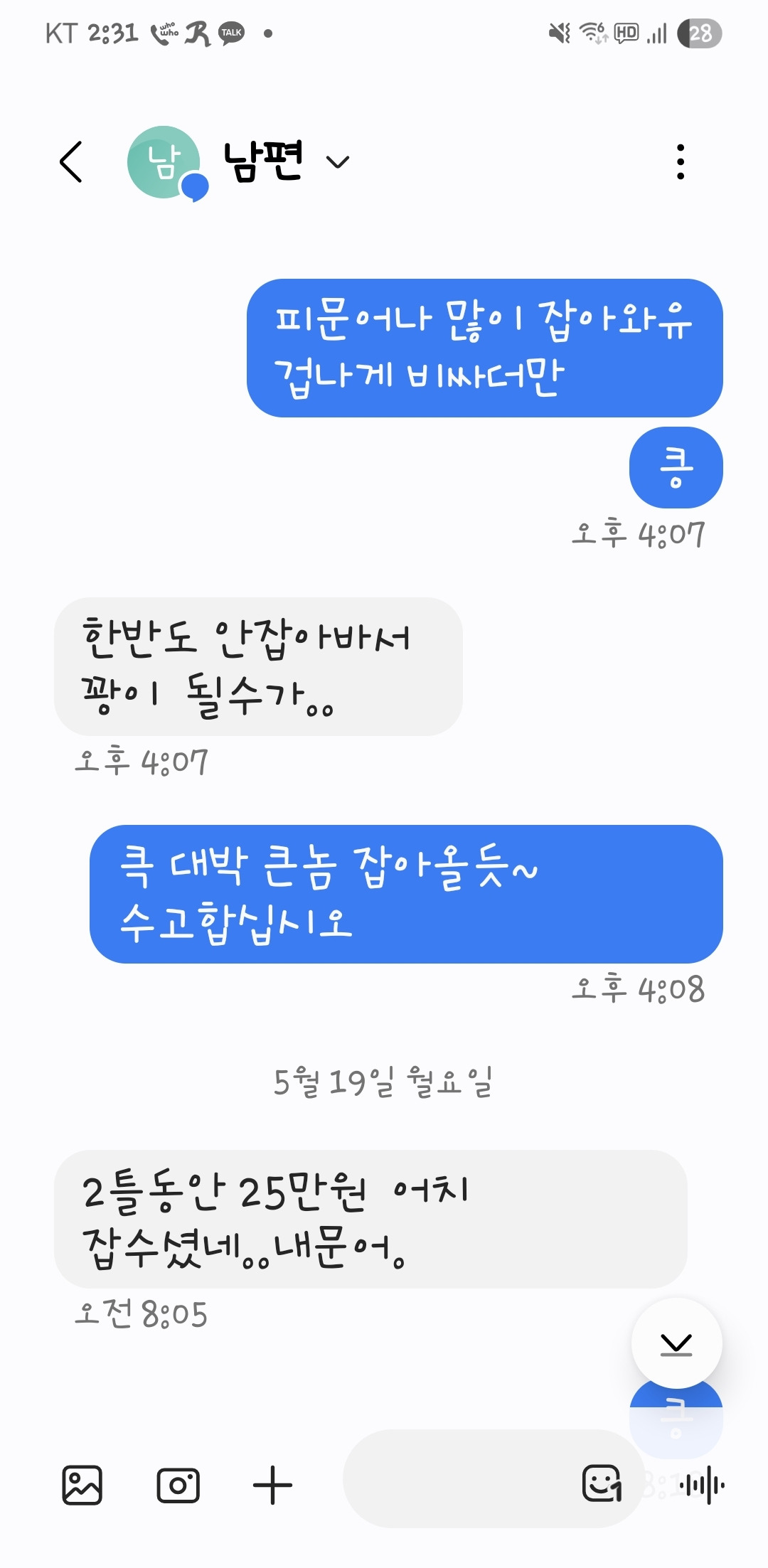 남편은 그러면서도 가족들 먹을 건 잘 챙겨다 준다 지난 금요일 저녁에는 퇴근하고 강원도까지 피문어 바다낚시를 다녀왔다 토요일 새벽 일찍부터 낚시를 했는데 집에 와서 낚시 아이스박스 속에 커다란 피문어가 2마리나 들어 있었다 한 마리는 2.5킬로나 되었다고 진짜 무겁고 커다란 문어 여수 돌문어 잡아온 적은 있지만 남편은 이번에 강원도 돌문어 낚시는 처음이었다 같은 회사 동료 형님과 함께
