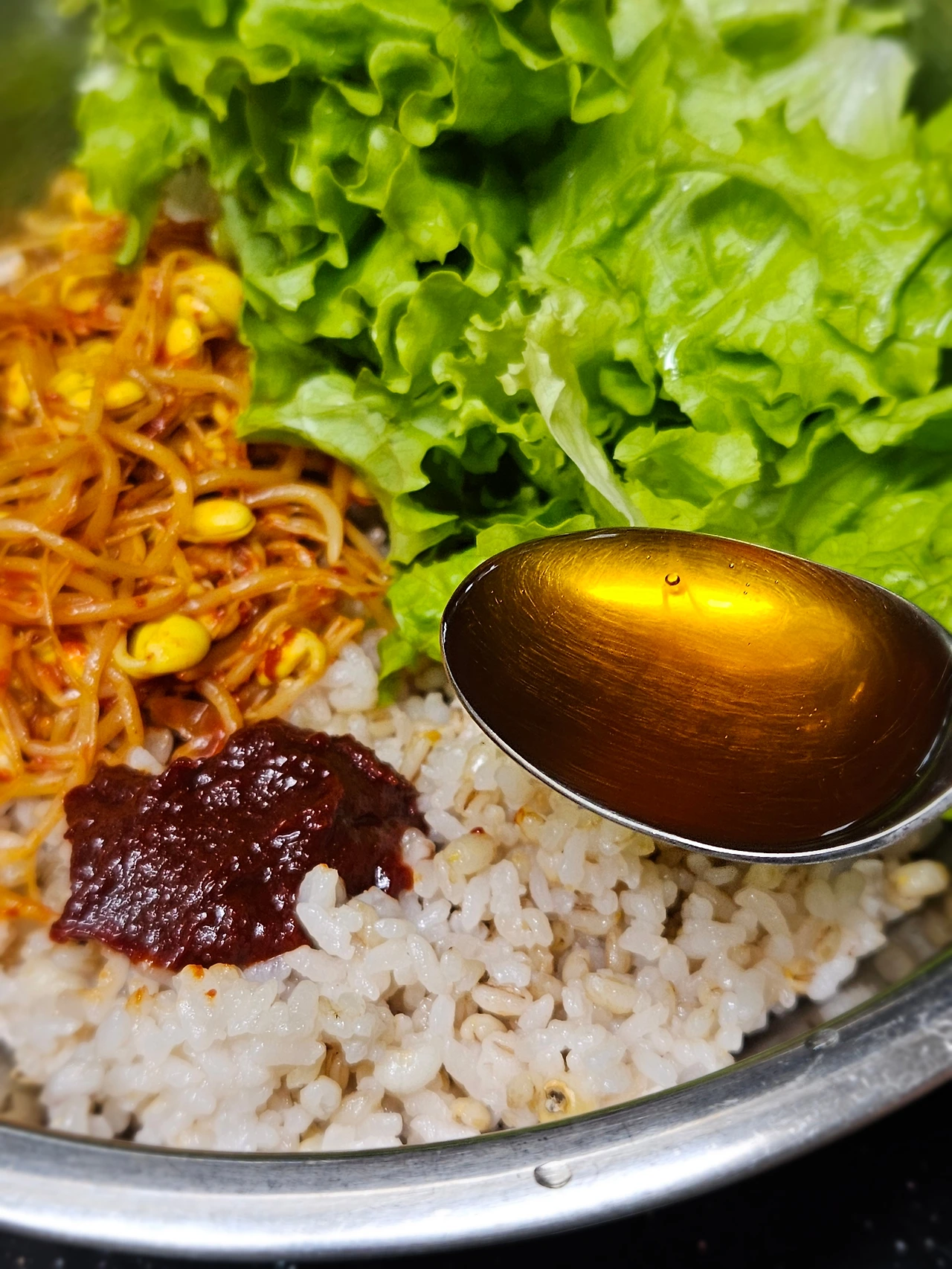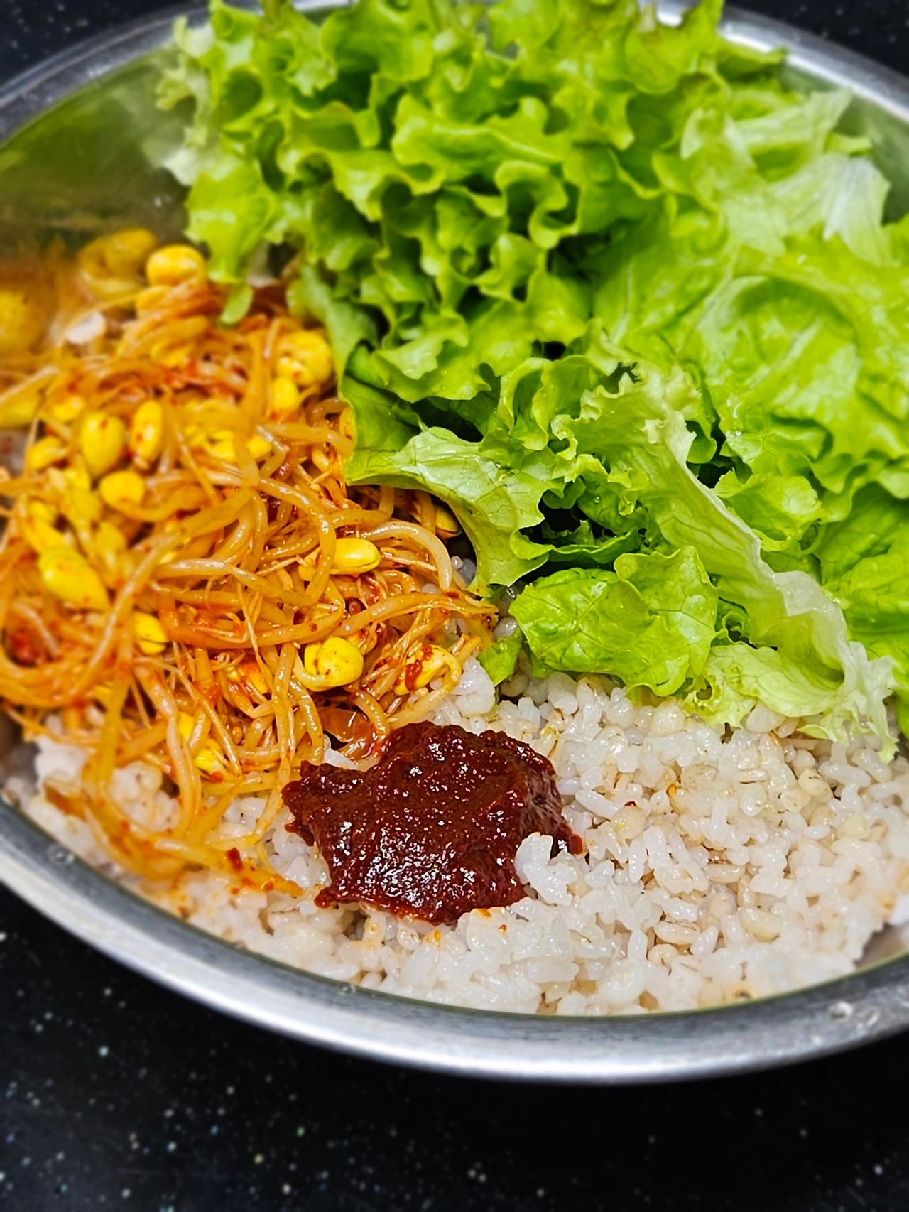 * 넉넉한 양푼에 밥 2/3 공기 푼 다음