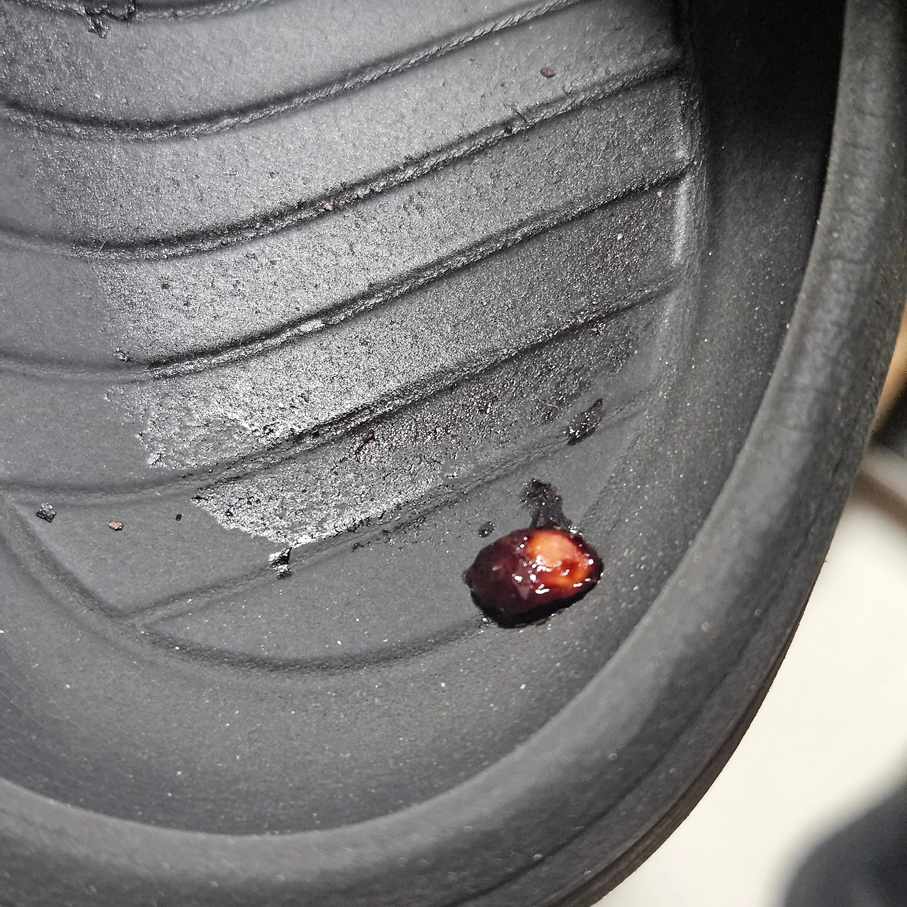 쪽에 끈적거리는 게 뭐지? 하고 발을 내려다