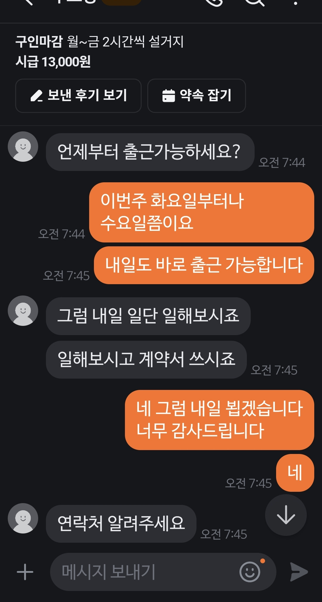잘 할 수 있을까? 아니야 나는 할 수 있어 오늘 하루 일하고 짤리더라도 내가 맡은 일에 최선을 다해야지 그렇게 나 자신에게 응원을 하고 있었다