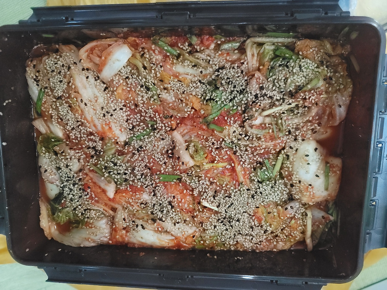 집에 도착하자마자 김치통 뚜껑을 열어보니 나도 모르게 미소가 지어졌다. 평소 통깨를 좋아하시는 엄마의 김치가 확실하다. 사랑 듬뿍 그득하게 뿌려진 깨만큼이나 엄마의 사랑은 셀 수가 없다.