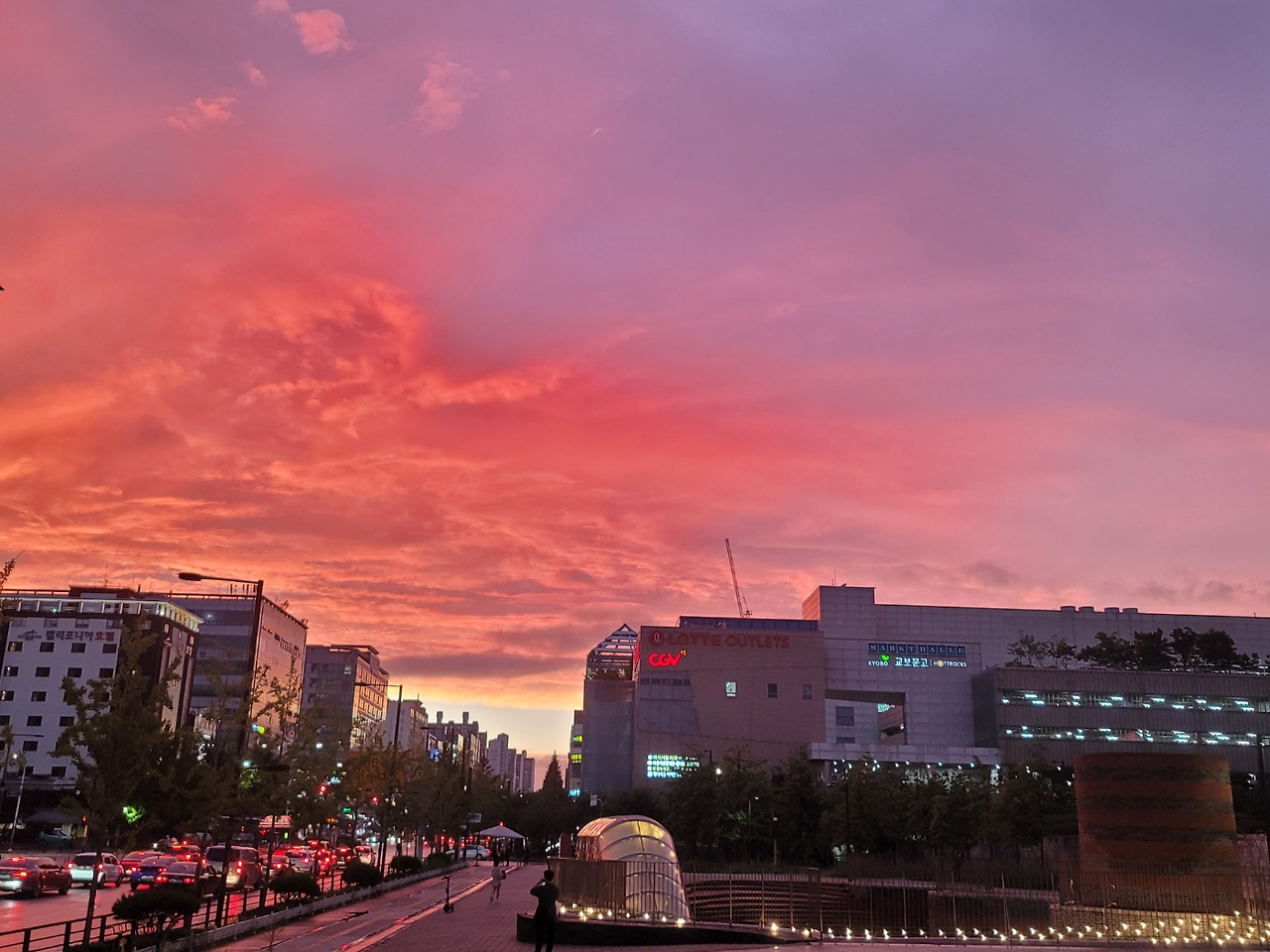 먹고 나서 소화를 시킬 켬 교보문고에 가기 위해 건물 밖으로 빠져나왔다. 그 순간, 우리는 동시에 눈앞에 펼쳐진 하늘을 보고 감탄할 수밖에 없었다. 이렇게붉은 보랏빛으로 물든 하늘을 본 적이 있는가? 인간의 영역으로는 감히 범접할 수 없는 자연이 주는 선물까지 받게 되었다. 마음과 더불어 눈까지 호강하는 이 저녁노을 안 봤으면 어쩔 뻔했니?!
