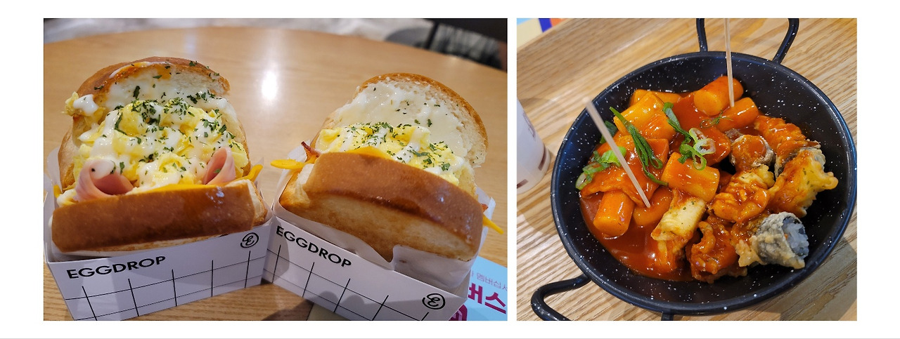 아이와 지난여름방학 먹방 계획 4가지 중 시흥하늘 휴게소 갈릭버터토스트를 먹겠다는 약속을 지키지 못했다. 방학은 지났지만 그 약속은 지키고 싶었다. 그렇다고 시흥하늘 휴게소까지는 갈 수가 없었다. 최대한 그와 비슷한 에그드랍으로 장소를 정했다. 벨라시타 지하에 가서 드디어 그토록 노래를 부르던 에그토스트를 먹었다. 하필 그 옆에 아딸 떡볶이도 있었다. 본의 아니게 범벅떡볶이도 추가했다. 토스트와 떡볶이가 의외로 궁합이 잘 맞았다. 괜히 옆에 있는 게 아니었다.