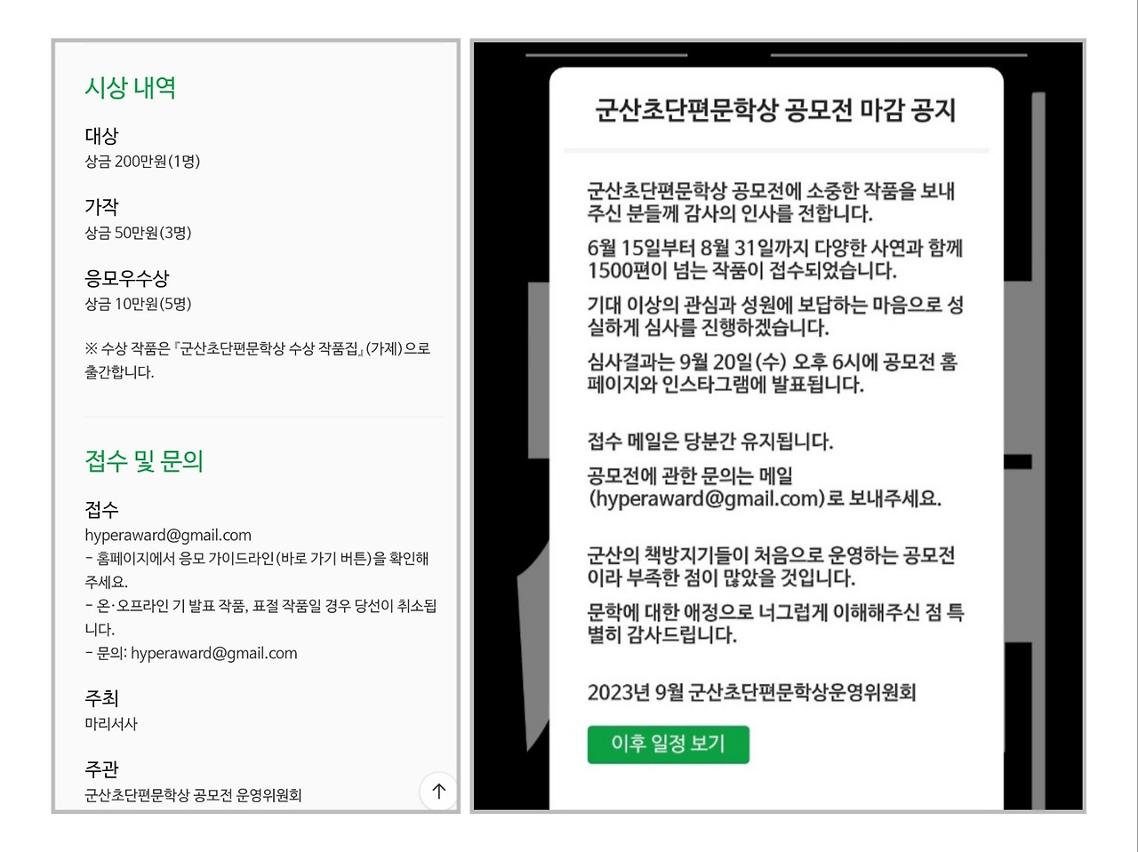 일주일을 편안하게 보냈습니다. 일주일에 하나 정도는 브런치에 글을 발행해야 하니까 공모전을 위해서 썼던 글을 써먹으려고 언제쯤 브런치에 발행할 수 있을까? 발표일이 궁금해서 군산초단편 문학상 홈페이지에 접속했습니다. 무슨 희망과 기대를 가지고 있는 건 절대 아닙니다. 단순히 발표 이후에 브런치에 발행이 가능하니까 발표 날짜만 확인하려고 했어요.