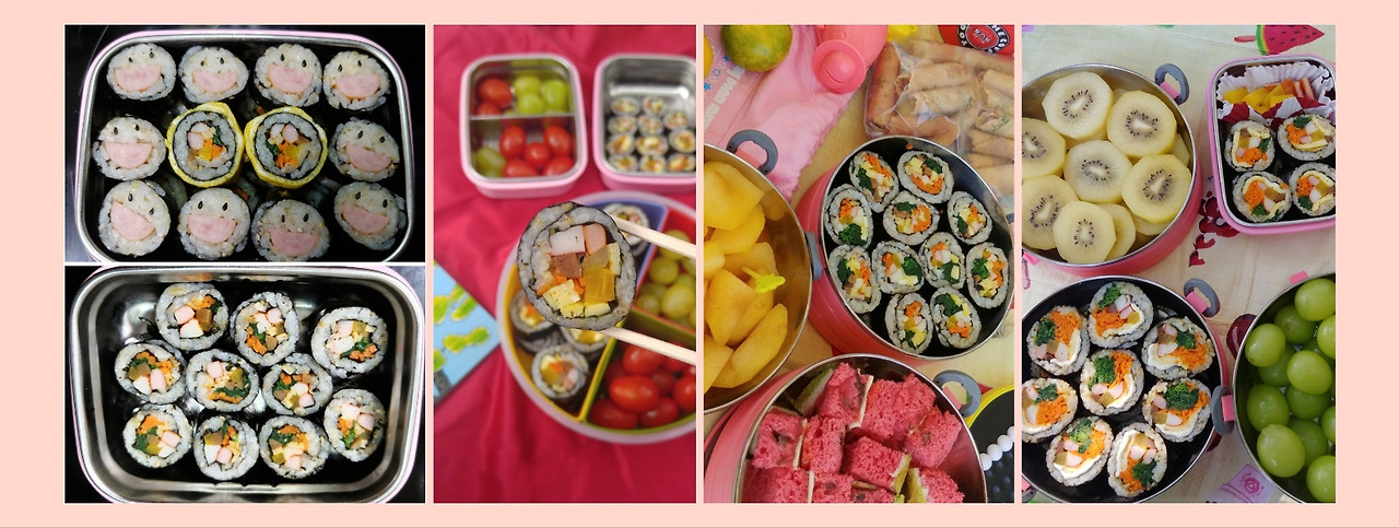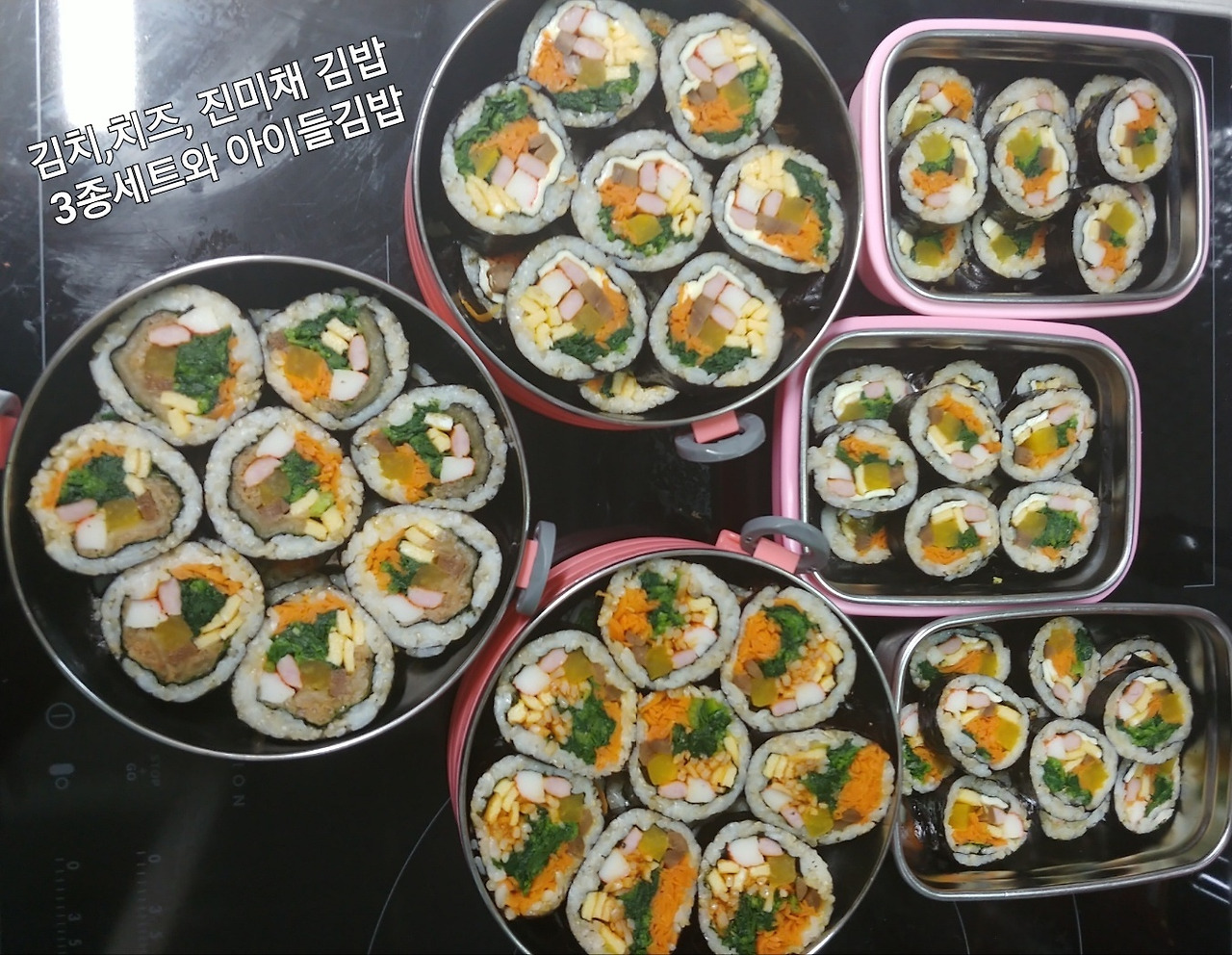 심지어 집에 손님이 올 때도 김밥을 싼 적이 꽤 있었고 아이친구집에 초대받았을 때도 김밥 3종을 준비해서 간 적이 있다. 그날 모인 세 가족 9명은 떡볶이와 매운 갈비찜 만찬을 즐기기로 했었다. 아이들 3명과 부모들 중 맵질이들을 위해서, 속을 달래기 위한다는 명목하에 애피타이져로 정성껏 준비한 김밥은 인기 폭발이었다. 다들 김밥집 차리자고 난리가 났지만 우리 집 식구만 침묵을 지켰고 거의 먹지도 않더라!