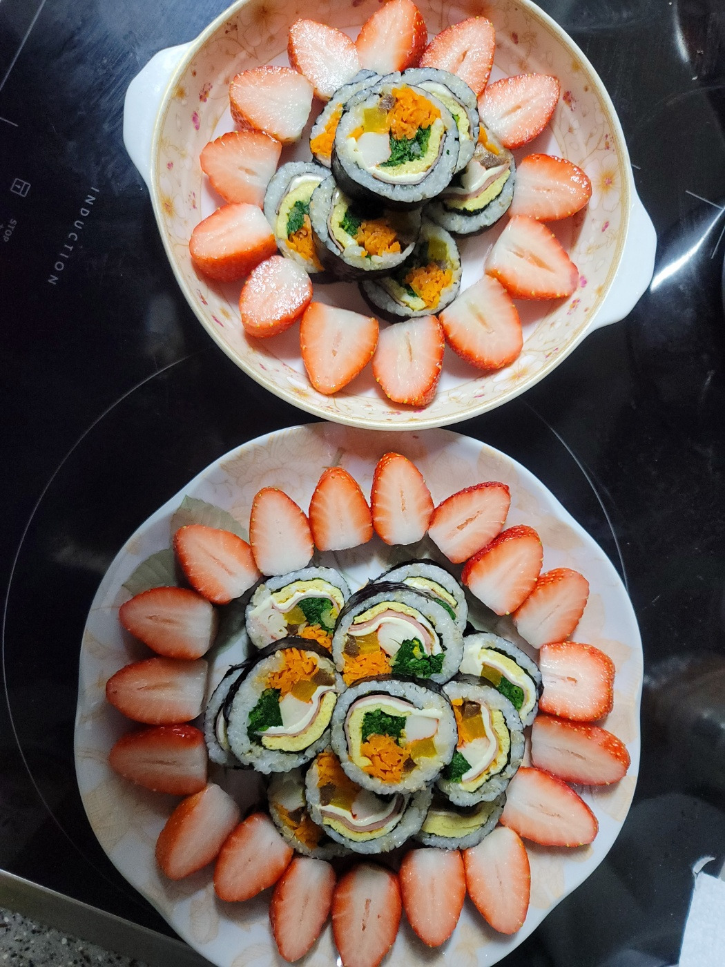덧붙임) 떡볶이에 김밥은 참을 수 있어도 이 계절, 김밥에 딸기는 어때요? 즤 집에서 저 혼자만 김밥이 사무치게 그립습니다.
