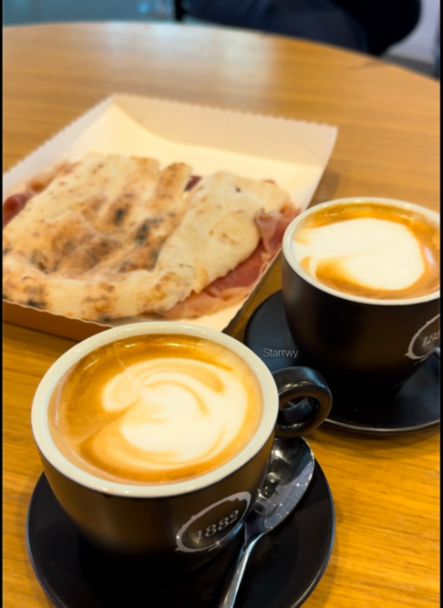 그렇게 공항 내 렌터카 대여 부스를 찾아 순번을 QR로 등록했는데, 대략 40분 이상 걸릴 것 같아 둘씩 나눠 아침 식사를 하고 오기로 했다. 렌터카 예약을 한 Y와 함께 같은 업체의 다른 대여 부스가 있는지 공항을 한바퀴 휘 둘러봤지만 없었기 때문에 바로 카페테리아에 갔다. 각종 파니니, 샌드위치 등과 커피를 파는 곳으로, 공항/항공사 직원들과 일반 고객들이 한창 아침 식사 중이었다. 우리는 프로슈토가 끼워진 얇은 샌드위치와 카푸치노 두 잔을 주문했다. 참고로 이탈리아에서는 카푸치노를 오전 11시 이후에는 안 시킨다고 한다. 외국인에게는 상관 없다고 하지만 이탈리아 사람들 사이에서는 불문율인가보다.
