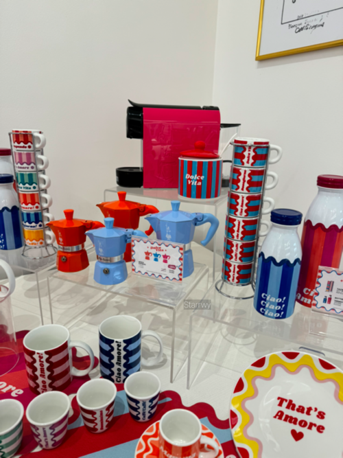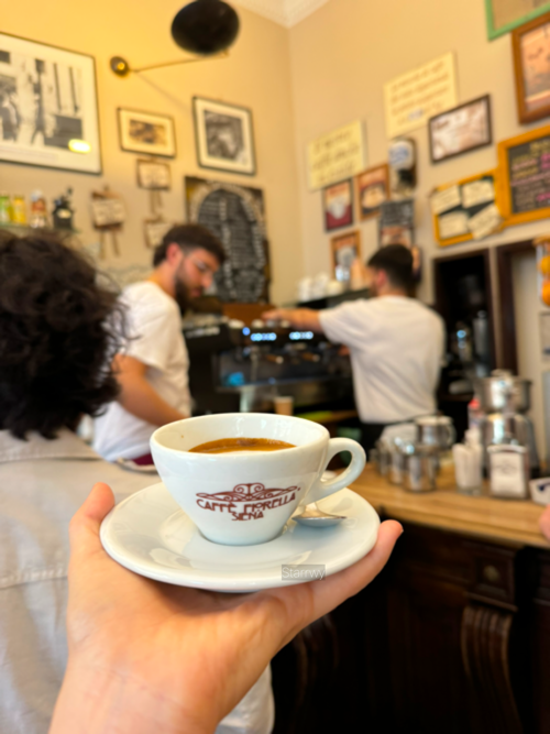 비알레띠(Bialetti)라고 하는 커피 모카포트로 유명한 브랜드의 가게가 있어 잠시 들렀다. 이탈리아 국기를 떠올리게 하는 삼색 조합부터 알록달록한 색까지 다양한 크기의 모카포트가 전시되어 있었다. 과감한 색 조합의 에스프레소잔 세트, 물병, 설탕 그릇, 숟가락 세트도 구비되어 있었는데, 한 마디로 모카포트로 커피를 끓여 설탕을 넣고 마시기까지 필요한 모든 것이 있었다. 모카포트에 올해 연도가 쓰여 있는 것도 있었는데, 아마 올해 이탈리아를 방문한 것을 기념하기 위함일 것이었다. 서울에 돌아와 몇 년이 흐르더라도 그 모카포트를 꺼내 커피를 끓인다면 잠시나마 그 모카포트를 샀던 24년 시에나의 여름으로 돌아갈 수 있을지도 모르겠다. 혹은 지인이 방문해서 커피를 끓일 때 그 모카포트를 보며 작은 추억을 한번 공유할 수 있을지도. 집에 이미 모카포트가 하나 있지 않았다면 하나 샀을 것 같다.