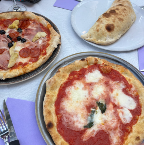 스프리츠 한 잔을 마시고 있자니 비는 조금씩 거세지는 한편 주문한 피자가 하나둘 나오기 시작한다. 3가지 피자와 그리스식 샐러드 하나를 시켰는데, 토마토 소스에 모짜렐라 치즈, 버섯, 아티초크, 올리브, 햄과 살라미가 올라간 Capricciosa가 가장 맛있었다. 어원을 찾아보니 Capricious(변덕스러운) 피자라는 뜻이란다. 다양한 토핑이 올라간 만큼 맛이 변화무쌍해서 그런 것 같다.