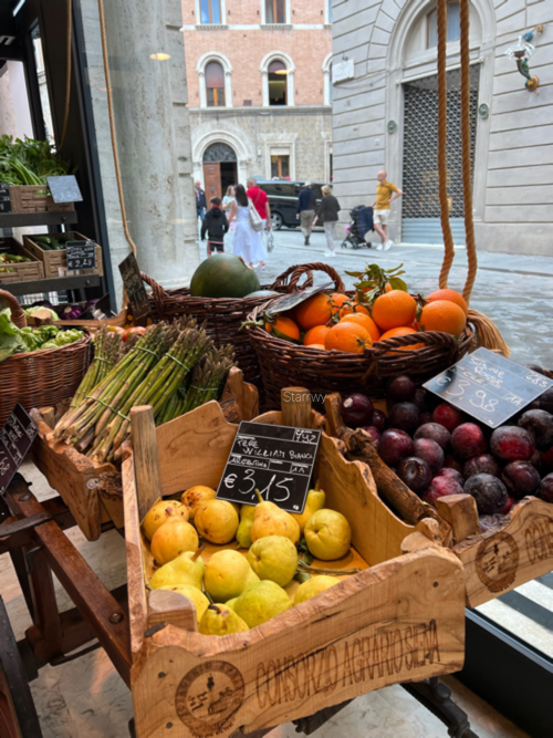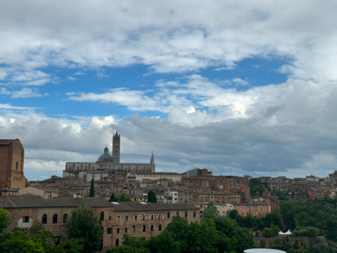 비누, 냅킨, 테이블보 등을 파는 작은 가게, 젤라또 가게, 토스카나 와인을 주로 파는 바틀샵, 살라미나 소시지, 생햄 등을 파는 가게 등을 지나쳐 다시 주차해둔 곳으로 돌아가기 시작했다. 5시에 와인 테이스팅을 하려면 슬슬 출발해야 할 것 같아서다. 저 멀리 보이는 시에나 대성당을 배경으로 사진을 남기고 오늘의 숙소, 와인 리조트로 돌아왔다.