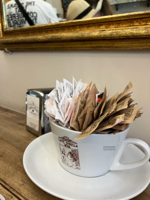 광장 옆의 작은 기념품점에서 자석, 엽서 등을 산 다음 커피를 충전하기 위해 카페에 갔다. 바 테이블 밖에 없는 아주 작은 카페 Torrefazione Caffetteria Fiorella. 손글씨로 쓰여진 메뉴가 정겹다. 무심하게 내려주는 카페 마키아토 한 잔과, 함께 나눠 먹을 작은 과자 두 조각을 샀다. 갖가지 설탕이 산더미 쌓여 있는 모습이 귀엽다. 딱 두 번의 넘김이면 다 마셔버릴 양이었지만, 한 방울이 아까울 정도로 맛있어서 목이 꺾이도록 털어마셨다.