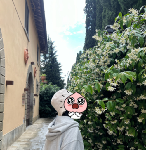 길을 따라 가는데, 어딘가에서 향기로운 냄새가 훅 끼쳤다. 근원은 꽤 멀리 있는 화분의 꽃이었는데, 이미지 검색으로 찾아보니 '오렌지 자스민'이었다. 이 즈음이 꽃이 피는 계절인지 토스카나 어디를 가도 군데 군데 오렌지 자스민이 피어 있어서 온통 저 향과 함께 여행을 하는 기분이었다. 향이라는 게 기억을 불러일으키는 가장 쉬운 매개체라는 이야기도 있는데, 나중에 이 향기를 통해 토스카나 여행을 추억할 수 있을 것 같아 더 소중했다.