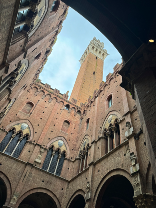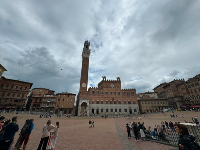 가장자리에는 만자탑(Torre di Mangia)이라는 높은 탑이 하나 있고, 그 옆에는 푸블리코 궁전이 있다. 비슷한 높이의 중세 건물들로 주욱 둘러싸인 광장에 우뚝 솟은 탑의 모습은 꽤나 이질적인데, 요즘 서울로 치환하자면 롯데타워를 보는 느낌과 유사한 것 같다는 생각이 들었다. 어쩌면 예전엔 저 탑에서 중세시대의 정신을 지배한 신, 하늘과 조금이라도 더 가까워지는 것 같다는 생각을 했을 수도 있겠다.