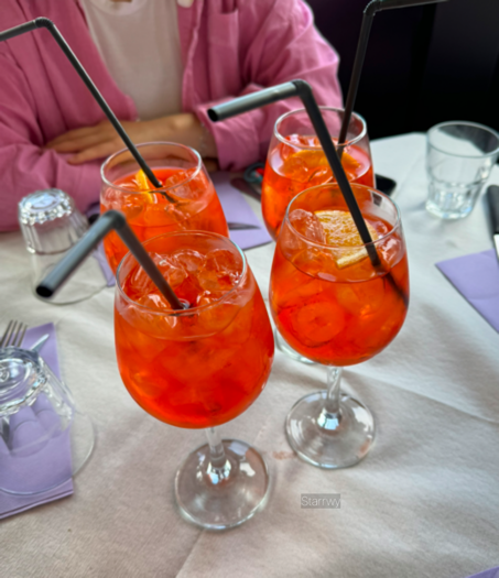 우리는 먼저 이탈리아식 식전주 스프리츠를 시켰다. 스프리츠는 프로세코(스파클링 화이트 와인)와 아페리티프 리큐어를 섞은 일종의 칵테일이다. 쨍한 햇살을 담은 것 같은 주황색 음료를 빨대로 쪽 빨아 마시면, 프로세코의 청량감은 그대로 느껴지지만 의외로 꽤 쌉쌀한 맛이 난다. 만약 환타 같이 달았다면 마시다가 오히려 빠르게 질렸을 수도 있겠다.