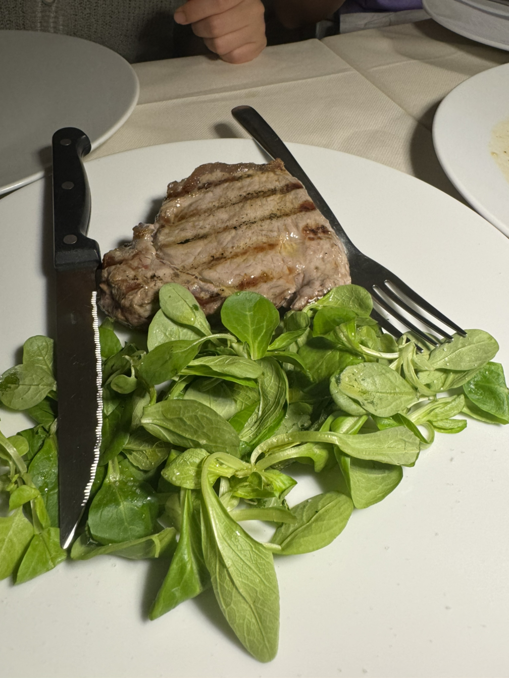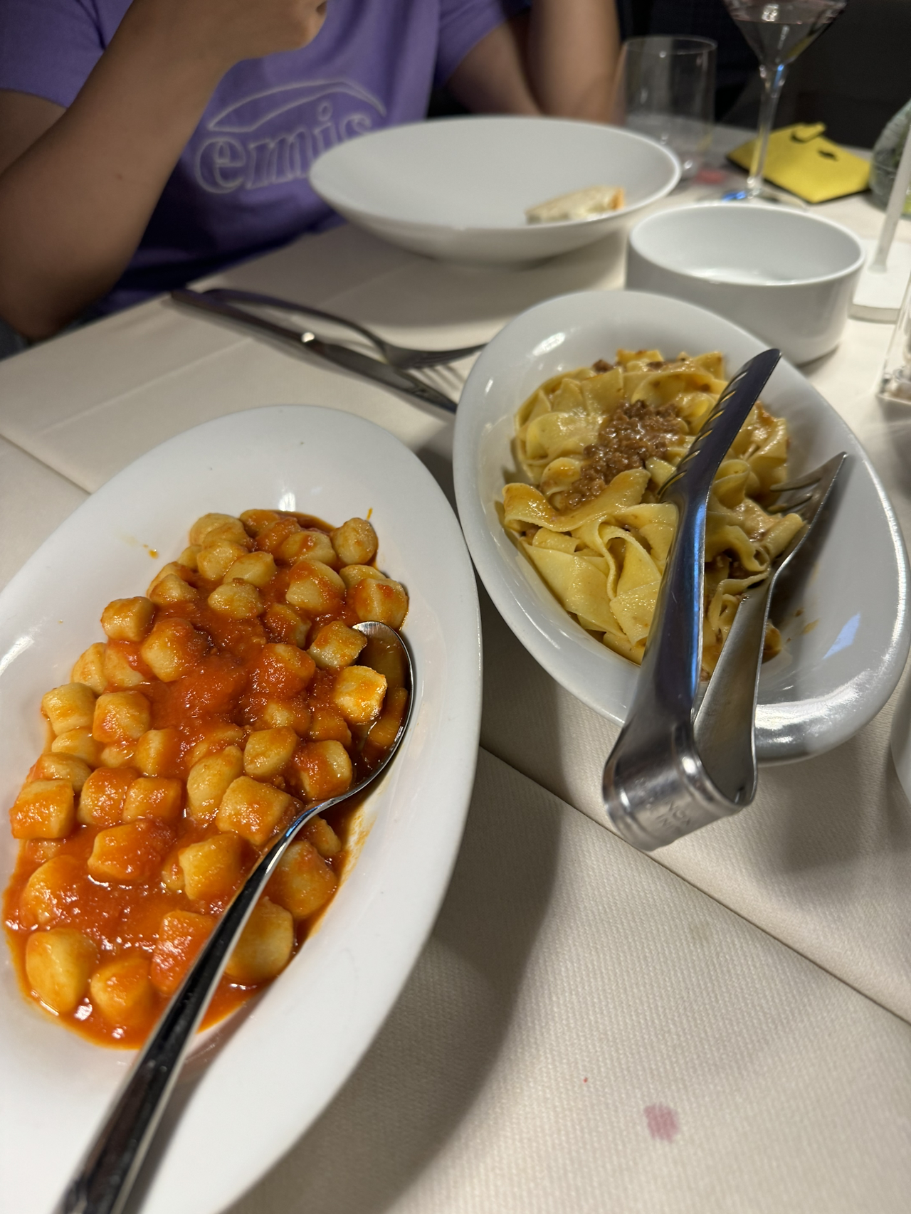 오픈 시간이 되고, 셰프도 도착해서 점원이 메뉴를 알려주러 왔다. 특이하게도 이 가게엔 메뉴판이 없고, 셰프가 오늘의 요리를 쭉 불러주는데, 다행이도 영어를 잘 하는 분이어서 메뉴를 정하는 데 큰 문제는 없었다. 파스타는 소스와 파스타면을 조합할 수 있었는데, 뇨끼는 꼭 먹어보고 싶어서 소스를 추천해달라고 했더니 토마토 소스를 추천해주었고, 그 지역에서 많이 먹는다고 하는 파스타면은 화이트 라구 소스를 추천해줘서 선택했다. 소고기와 구운 야채, 닭고기 구이를 주문하고 여기에 어울리는 와인을 한 병 추천 받았는데 처음 추천해주었던 와인은 우리 기준에 산도가 너무 높았다. 그렇게 말씀을 드리니 다른 와인을 추천해주었는데, 이건 꽤 마음에 들었다.