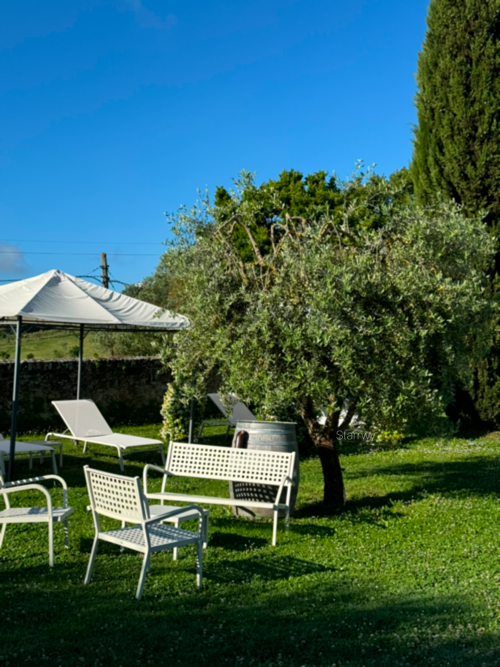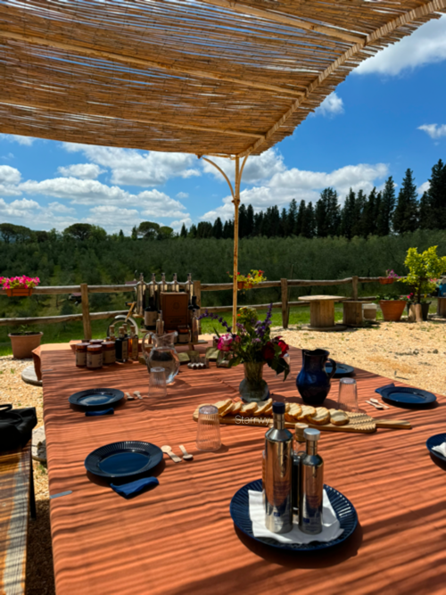 그리고 대망의 올리브유 시식. 다시 차를 타고 올리브 밭을 지나 넓은 안마당과 두 채의 건물이 자리하고 있는 언덕으로 올라갔다. 탁 트인 언덕 아래로 올리브 나무 밭이 넓게 펼쳐졌다. 앞마당엔 우리를 위한 테이블이 준비되어 있었는데, 강한 햇살을 살짝 가려주는 나무 발로 만들어진 지붕이 꽤 잘 어울렸다.