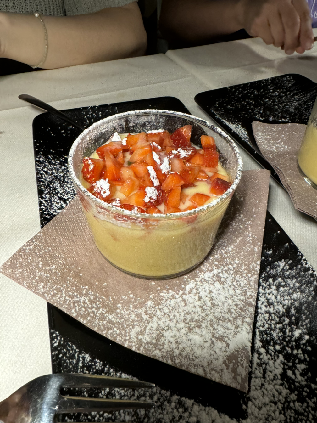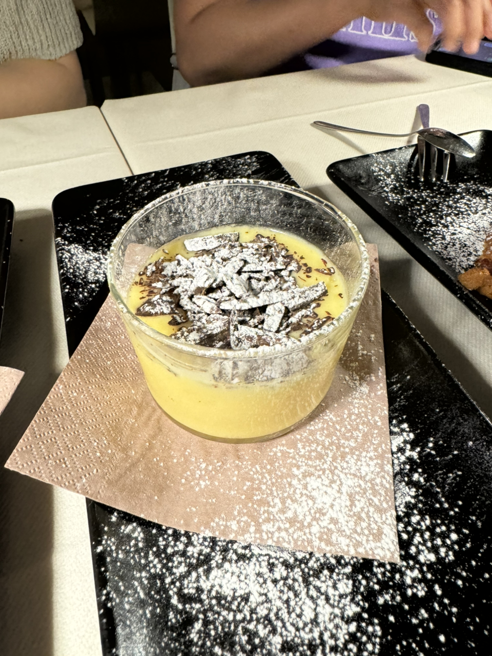 한참 식사를 마무리하던 때 식당 한쪽 벽면을 거의 가득 채운 그림 속 익살스러운 얼굴의 주인공이 나타났다. 셰프의 아버지처럼 보이는 사람이었는데, 그림과 정말 똑같이 생기셔서 너무 재밌었다. 디저트로 원래는 두 개를 시키려고 했는데, 역시나 메뉴판 없이 말로만 설명을 듣다 미스커뮤니케이션으로 인해 디저트가 종류별로 하나씩 다 나왔다. 커스터드 같은 크림에 초콜렛 또는 딸기를 올린 것과 베이커리 종류. 배는 불렀지만 맛있어서 거의 다 먹었다. 에스프레소로 마무리를 하고 다시 숙소로.