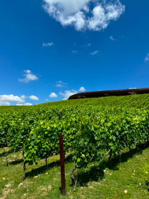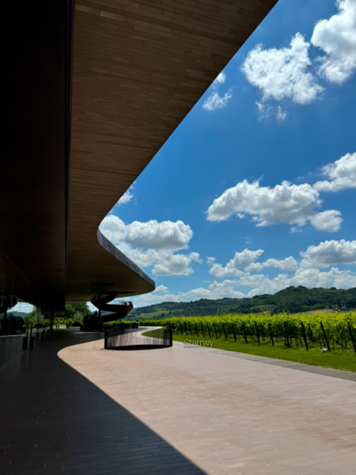 널찍한 주차장에 주차를 한 뒤 포도 나무가 줄지어 있는 언덕길을 오르면 안티노리 와이너리 본 건물이 나온다. 유리 창문과 나선형의 계단이 눈에 띄는 건물은 전체적으로 어두운 와인색과 검은색으로 이루어져 차분함과 웅장함이 동시에 느껴졌다. 파란 하늘과 동동 떠있는 하얀 구름들, 연두빛의 포도나무 잎까지 완벽한 풍경이었다.