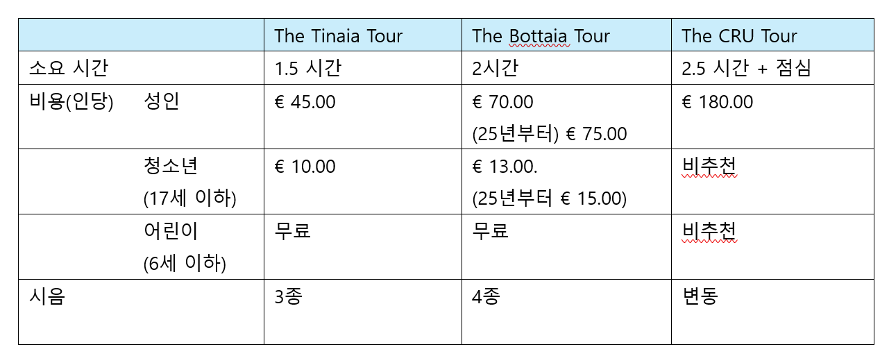 오늘 이곳에 오기 위해 우리는 두 달 전 예약이 열리자마자 사이트에 들어갔다. 투어는 이탈리아어로 진행되는 프로그램과 영어로 진행되는 프로그램이 있는데, 4명의 인원이 한번에 영어 투어를 신청하려고 하니 예상보다 경쟁이 치열했던 것 같다. 원래 하고 싶었던 날엔 이미 예약이 마감되어 오늘 예약을 할 수 밖에 없었다. 그렇기 때문에 반드시 미리 예매를 하고 가는 것을 추천한다. 대기 시간을 포함하여 전체 투어 시간이 3시간 정도로 꽤 오래 걸리기 때문에, 부지나 와인샵도 함께 구경할 수 있게 여유롭게 반나절 정도는 잡고 가는 것이 좋다. 프로그램에 따라 더 짧거나 긴 것도 있는데, 사이트 상 환불 불가로 적혀 있어 일정을 잘 고려하거나 자세한 취소/환불 규정은 사이트에서 참조하는 걸 추천한다.