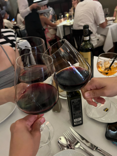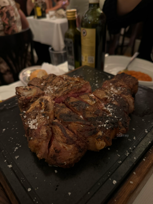 식사의 시작은 진토닉. 배가 많이 고프지는 않아서 토마토 스프와 트러플 크림 파스타, 티본 스테이크를 와인과 함께 주문했다. 따뜻하지도 차갑지도 않은 토마토 스프는 굉장히 신선해서 색다르게 먹을 만 했고, 파스타는 예상되는 맛이었다. 드디어 훌륭한 비주얼의 피렌체식 스테이크가 불판 위에서 지글대며 나왔다. 뻔한 스테이크지만 정말 너무 맛있었다. 생각보다 더 부드럽고 잡냄새 없이 고소한 고기맛. 이번 여행에서 돌아온 후 주변에서 어떤 음식이 제일 맛있었는지 물어보면 Top3 중 가장 먼저 이 스테이크를 이야기할 정도였다.