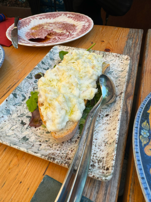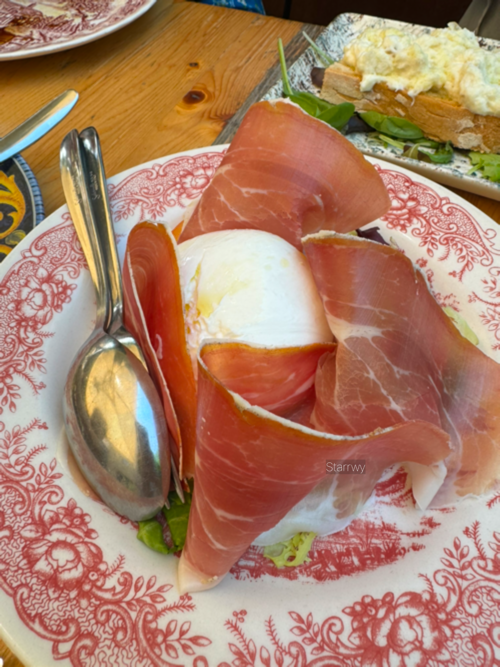 구글 지도로 확인했던 메뉴와는 사뭇 다른 것으로 보아 메뉴는 주기적으로 업데이트가 되는 듯 했다. 다 맛있어보였다. 오늘 식사의 시작은 부라타 치즈와 프로슈토를 올린 샐러드, 그리고 흰살 생선을 시즈닝하여 갈아 올린 빵. 한국에서 부라타 치즈를 즐겨찾는 편은 아니었는데 프로슈토와 함께 먹으니 너무 맛있어서 계속 손이 갔다. 소금과 후추처럼 당연히 테이블에 준비되어 있는 올리브유를 듬뿍 뿌리면 한층 더 맛있어진다. 흰살 생선을 올린 빵은 이전엔 먹어본 적이 없는 메뉴여서 궁금해서 시켜봤는데, 대성공이었다. 곱게 갈린 생선의 간이 딱 맞아서 아주 좋았다. 후추를 추가하면 풍미가 더 좋아진다.