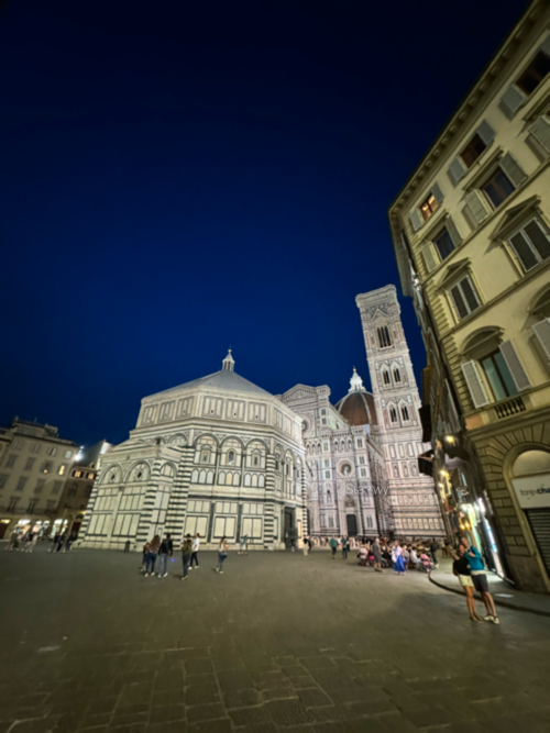 배불리 식사를 마치고 거리를 구경하며 숙소 방향으로 걷기 시작했다. 광장엔 회전목마도 있고, 그 유명한 산조반니 세례당과 산타 마리아 델 피오레 대성당, 조토의 종탑 앞엔 밤에도 인파가 굉장했다. 엄청난 규모의 세밀한 조각들은 아무리 사진을 찍어도 제대로 담기지가 않는다. 잘은 모르겠지만 조각상 하나 하나에 다 의미가 있고, 유명한 성인 또는 성직자의 모습을 본뜬 것이겠지. 그리고 대성당 옆에는 두오모를 설계한 브루넬레스키의 조각상이 마치 두오모를 올려다보는 듯한 모습으로 있었다. Y는 여행 준비를 하며 이 건축가에게 깊은 감명을 받았었는지, 그 앞에서 사진을 찍어줄 것을 요청했다.