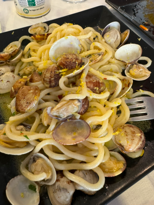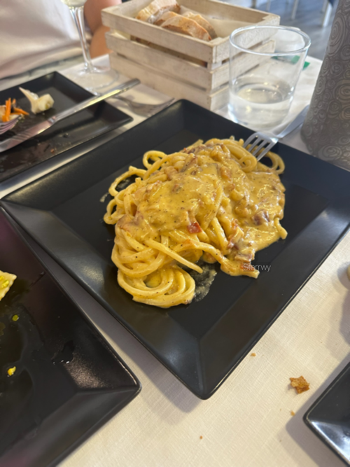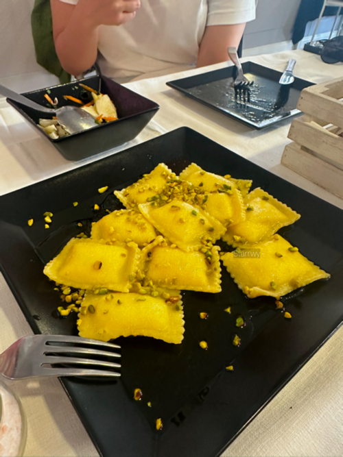 해산물 샐러드와 레몬 라비올리, 까르보나라, 봉골레를 주문했다. 레몬의 상큼한 맛이 피스타치오와 잘 어우러지는 라비올리는 속에 치즈가 채워져서 고소했다. 레몬으로 파스타의 맛을 내는 건 익숙하지 않았던 터라 자꾸 손이 갔다. 조금 얇은 파스타 면으로 한국에서 한번 따라해보고 싶은 맛.