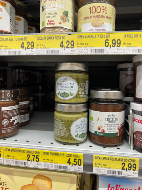 다시 숙소로 올라오는 길, 동네 식료품점도 문을 열어 잠깐 구경하러 들어갔다. 그리고 와인 리조트에서부터 별렀던 피스타치오 스프레드를 인원에 맞춰 구입했다. 우리의 요리사 K에 의하면 포카치아 같은 이탈리아식 빵에 피스타치오 스프레드를 바르고 치즈, 잠봉 등을 끼우면 아주 꿀맛이라고 한다. 물론 그냥 빵이나 크래커에 먹어도 좋다. 방금 들른 까르푸 익스프레스보다 조금 더 선별된 제품들로 가득한 가게를 한참 구경하다가 막판 짐을 싸기 위해 숙소로 서둘러 올라갔다.