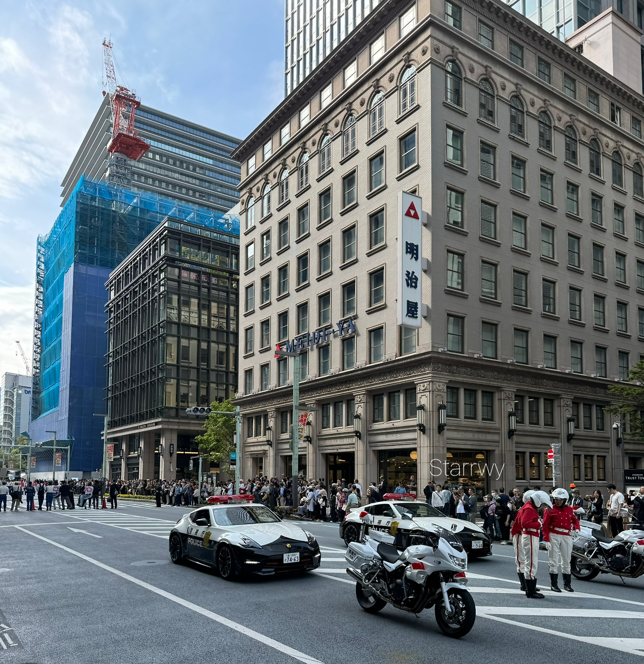 다카라초역에서 내려 밖으로 나오니 시간은 아직 10시 반. 인적이 드문 전형적인 일본 뒷골목을 경쾌한 걸음으로 통과했다. 호텔 앞의 큰 도로에서 무슨 행진을 하는지 경찰들이 교통을 통제하고 있다. 뽐내기에 최적화된 유니폼을 입은 경호인들이 늘어선 사람들에게 도로로 나오지 말아달라는 듯한 안내를 해댔다. 호텔에 얼른 짐을 맡겨두고 우리도 구경꾼 무리에 합류했다. 인파에 가려 잘 보이진 않지만 저 멀리 악단의 연주가 조금씩 가까워지고 있었다.
