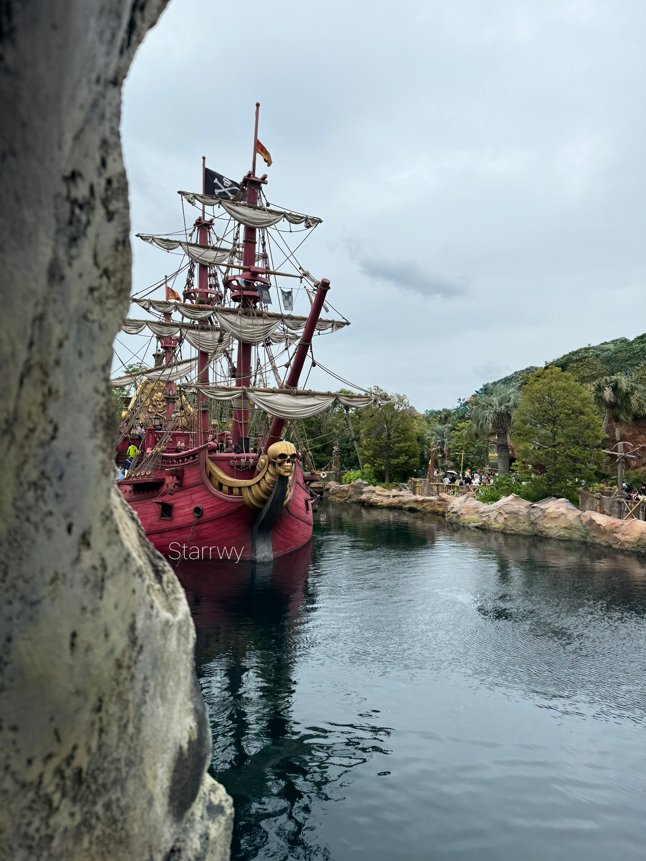 진짜 마지막으로 초입의 디즈니 스토어들과 토이 스토리 구역으로 향하는 길. 비가 와 구름이 가득한 하늘도 꽤 멋지다. 주기적으로 용암이 분출되는 산을 지나 항구 컨셉의 구역을 지난다. 모든 것이 그럴듯하고 멋있게 꾸며져 있어 그 사소한 디테일과 진심에 감동하게 된다.