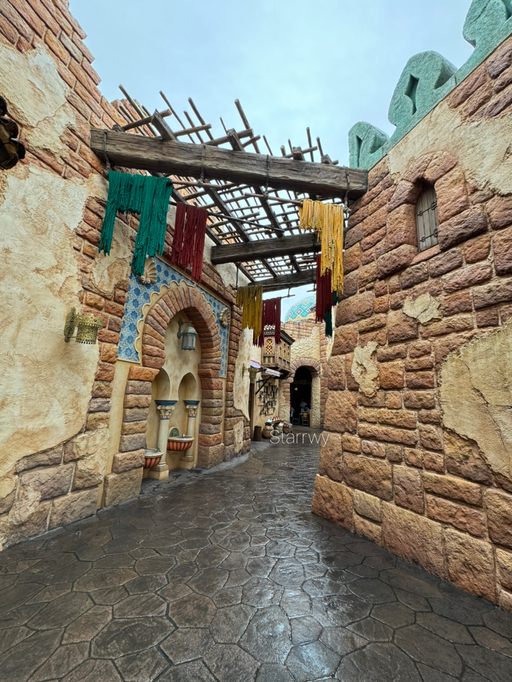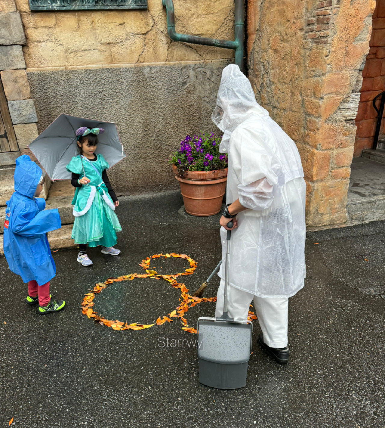 알라딘 컨셉의 구역을 구경하다가 점점 굵어지는 빗줄기를 감당하기 위해 우비(판초 스타일)를 사 입었다. 한켠에서 아저씨가 낙엽으로 미키 모양을 만들고 계셨는데 아이들이 그걸 보며 즐거워하고 있었다. 마음이 몽글몽글해지는 광경이다. 작고 사소한 것에도 마음을 담으면 어떤 것이든 그게 우러나와 주변을 즐겁게할 수도 있는 것이려나.