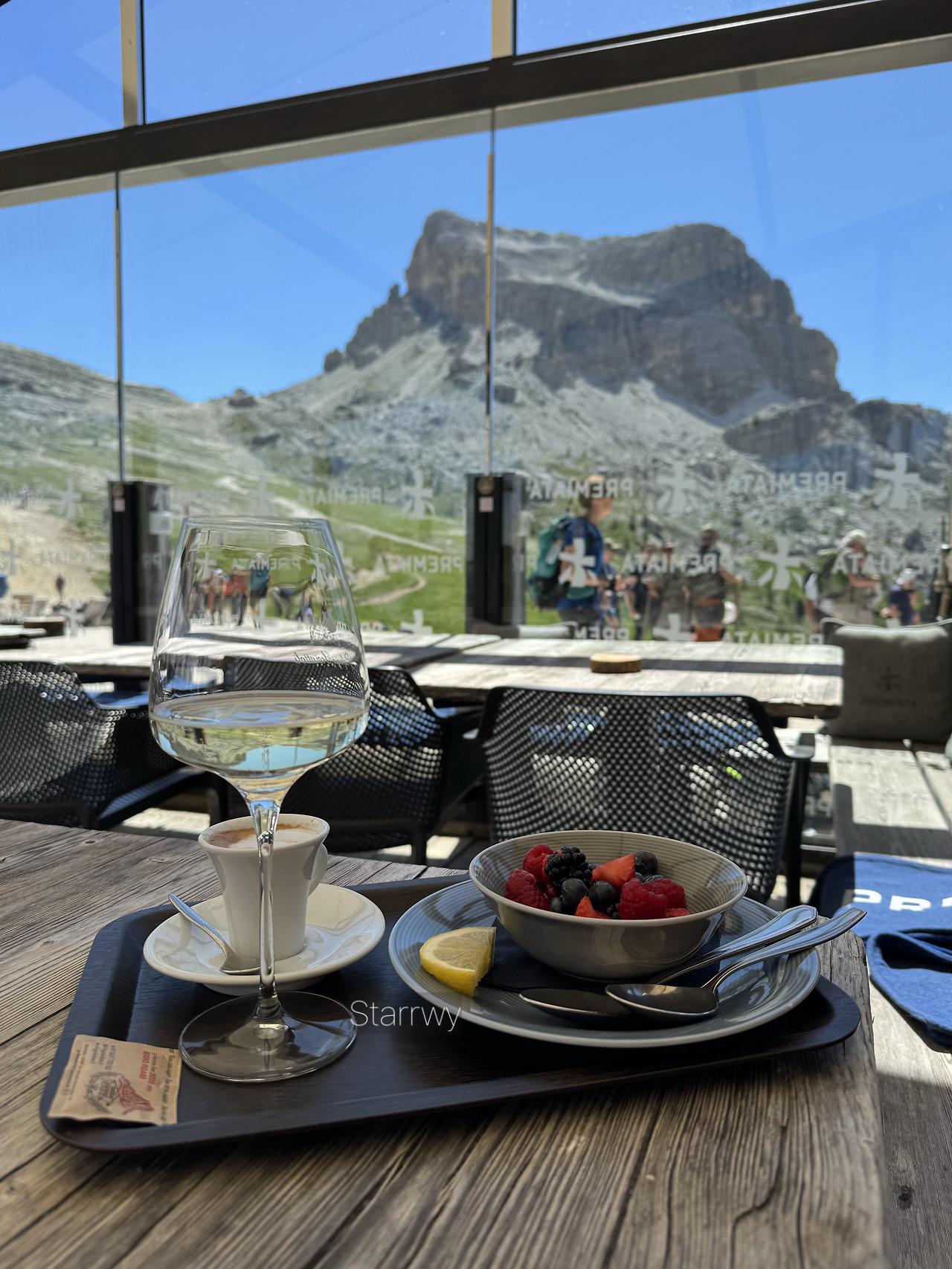 미끄러운 돌 비탈길을 넘어지지 않기 위해 신경을 곤두세워 조심스레 내려가니 다리에 힘이 조금 풀리는 느낌. 이번에도 라바레도 산장의 그늘에서 잠시 쉬어 가기로 했다. 마침 옆 자리에 한국에서 오신 엄마 동년배의 부부와 함께 쉬게 되었다. 두 분도 은퇴를 하고 돌로미티에 오셨다고. 그 분들이 말씀해주시길, 이렇게 힘이 든 게 이 곳의 고도가 높아 공기가 희박하기 때문이라고 한다. 한국에서 이 정도 하이킹하는 건 그렇게 힘들지 않을 거라고 하셔서 내심 우리 체력이 정말 이렇게까지 좋지 않은 건 아닐 수 있어 다행이라는 생각이 들었다. 이미 돌로미티는 많이 돌아보시고 다른 나라로 곧 간다는 분들에게 묻지 않을 수 없는 질문, 돌로미티에서 어디가 가장 좋으셨어요?