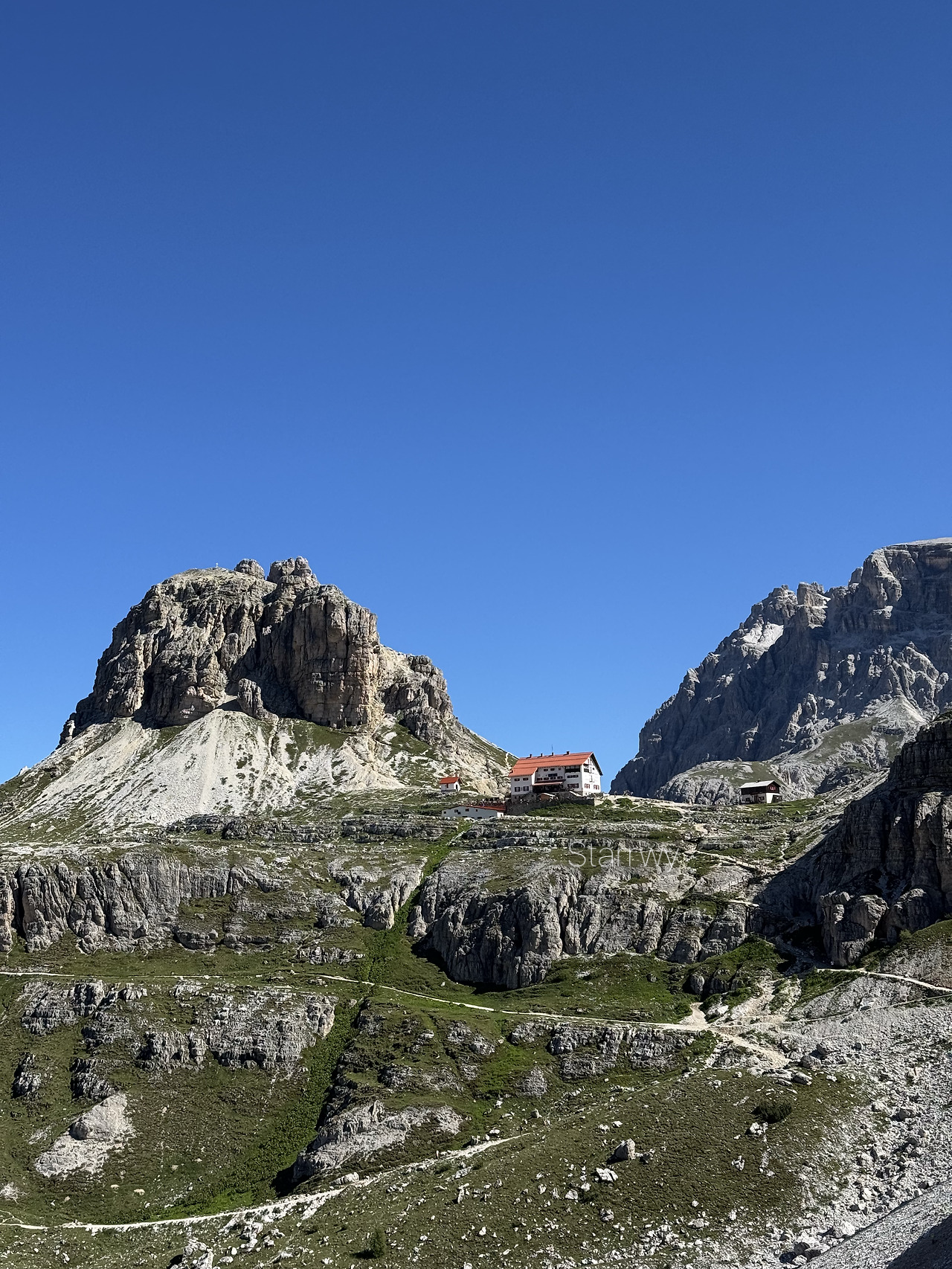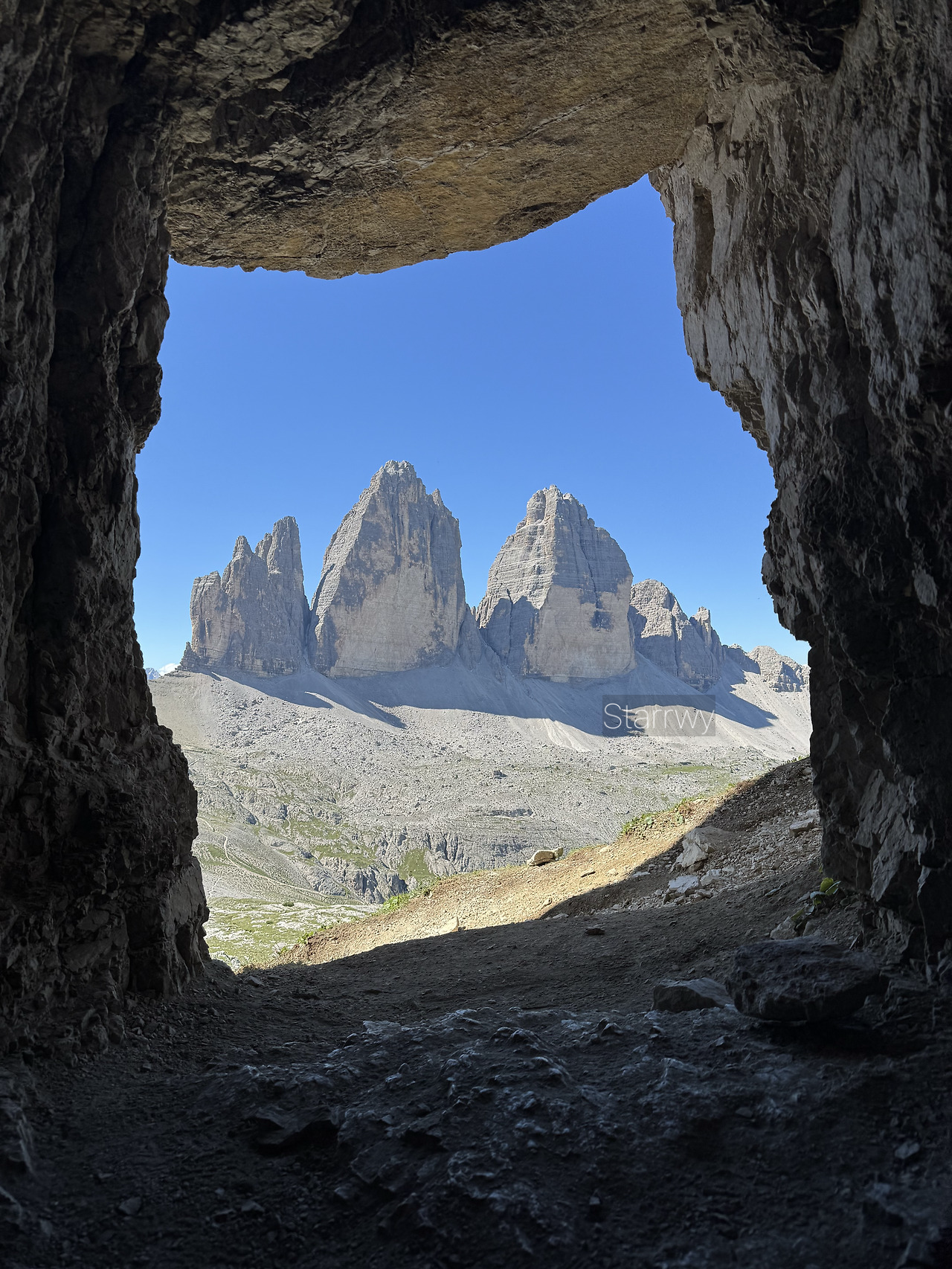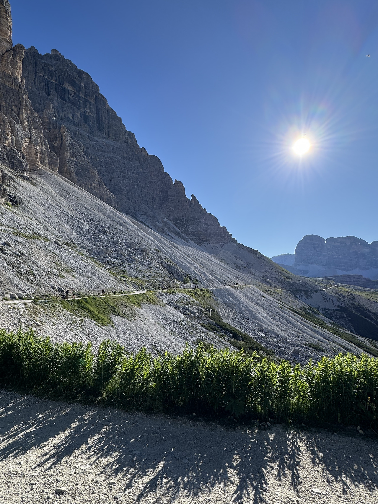 마지막 계단과 경사로를 올라 로카텔리 산장에 도착했다. 그러나 우리의 최종 목적지는 바로 산장 뒤 편의 동굴. 끝이 막힌 작은 동굴 안에 들어가 동굴을 프레임 삼아 트레치메가 보이는 실루엣 사진을 찍는 거다. 엄마도 꽤 지치신 것 같았는데 이 사진을 찍기 위해 두 시간 이상 걸어온 터라 포기하지 않겠다는 의지를 불태우셨다. 아주 가파른 경사로 조금 더 올라갔다.