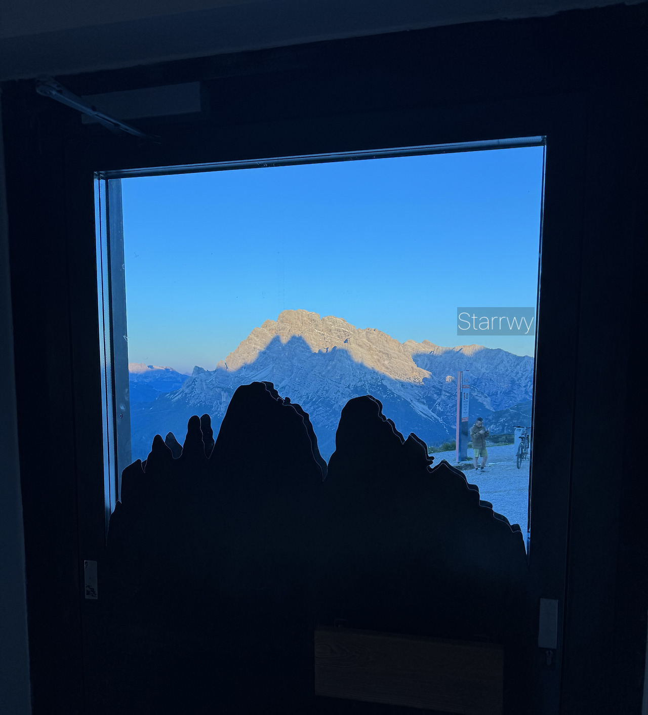 해뜨는 돌로미티의 모습을 한참 즐기다 산장 안으로 들어가니, 아침 식사를 하기 위해 줄이 늘어섰다. 그새 오픈시간이 되었나보다. 문이 열리고, 내가 창가의 좋은 자리를 잡는 사이 엄마가 먼저 아침식사를 가져오셨다.