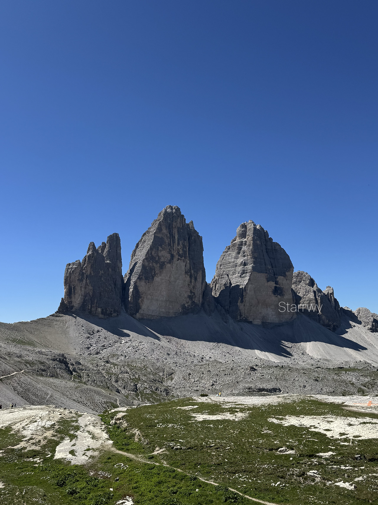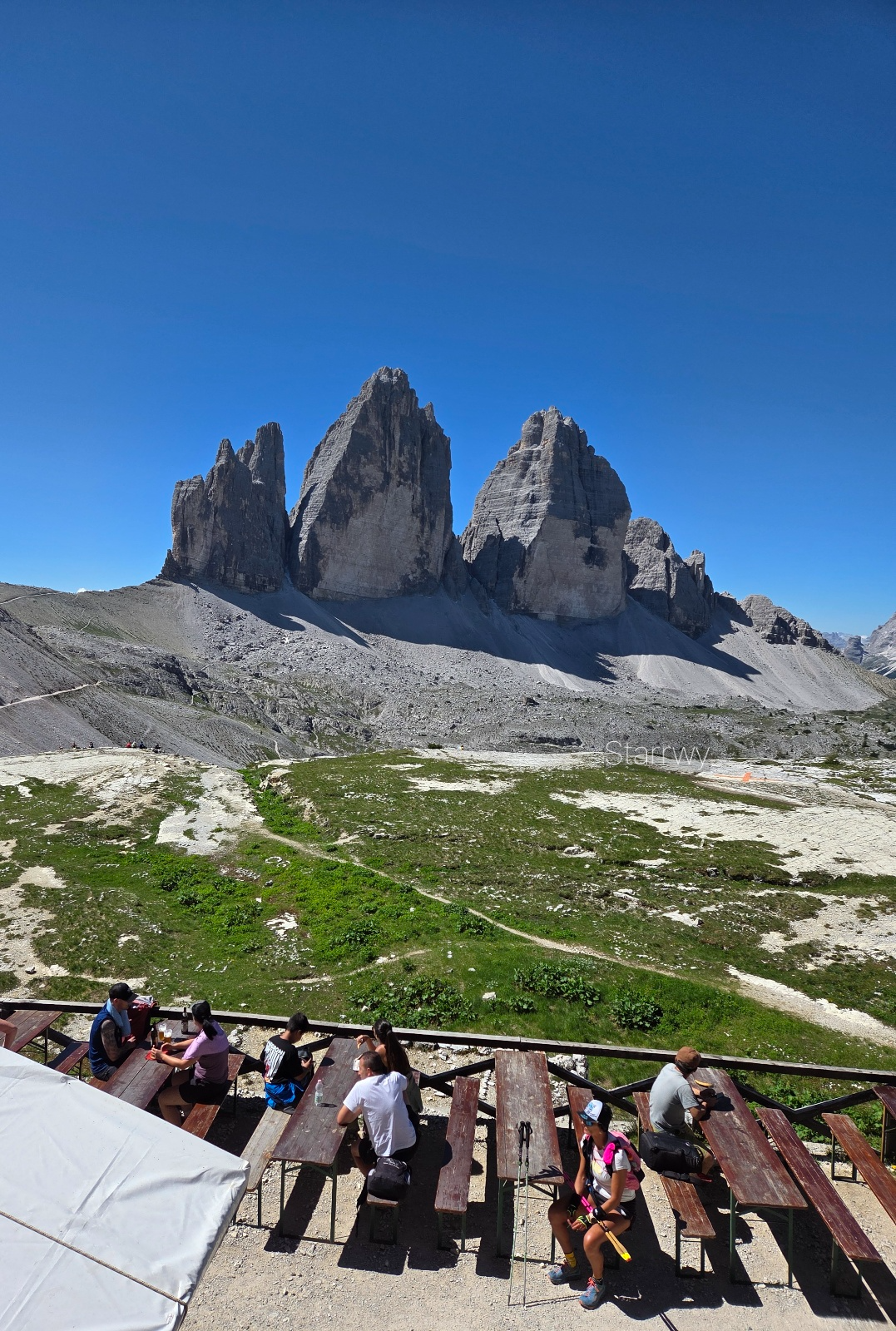 능선을 넘어가니 점점 더 가까워지면서 사진에서 보던 모습으로 변하는 트레 치메(Tre Cime di Lavaredo). 여기까지 오는 길에서는 시선이 대각선 방향이라 세 개의 봉우리가 거의 하나처럼 보였는데, 제대로 마주한 앞모습의 웅장한 크기에 조금 놀랐다. '세 개의 봉우리'라는 뜻과 같이 커다란 바위산 3개가 붙어있다. 3이라는 숫자가 묘한 안정감을 준다. 파란 하늘과 대비되는 트레 치메를 배경으로 우리도 기념 사진을 남겼다. 한국에서 단체 관광을 오신 분들이 꽤 많이 계셔서 사진을 부탁하기 좋았다.