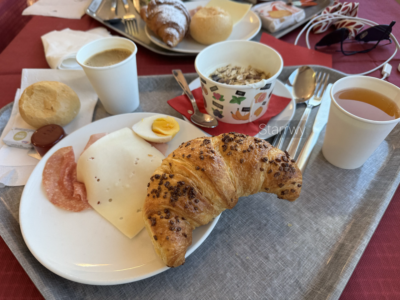 빵, 잼, 삶은 계란, 요거트와 그래놀라, 치즈, 햄, 주스, 커피로 구성된 꽉 찬 조식. 유럽식 아침 식사의 전형 같아 맘에 들었다. 오늘은 꽤 긴 트레킹이 예정되어 있기 때문에 든든히 먹었다. 다만 무료로 제공되는 커피는 좀 맛이 없어서, 한국에서 가져온 비장의 무기, 믹스커피를 꺼냈다. 뜨거운 물을 가져와 달달한 믹스커피를 마시니 이제야 만족스럽다.