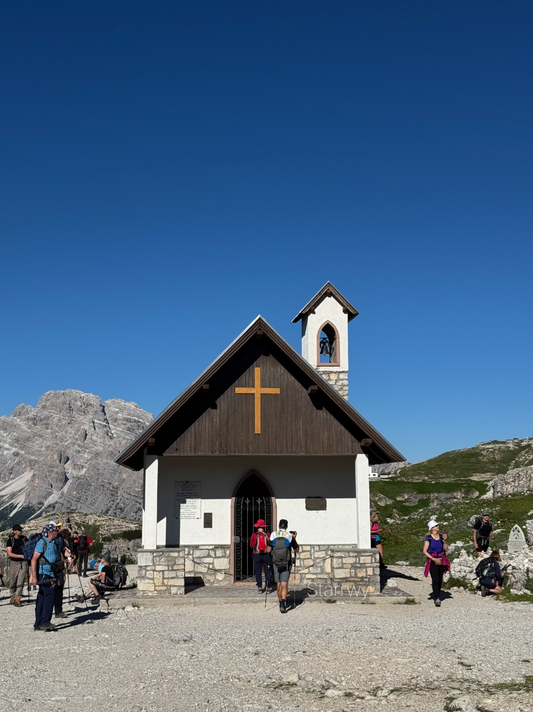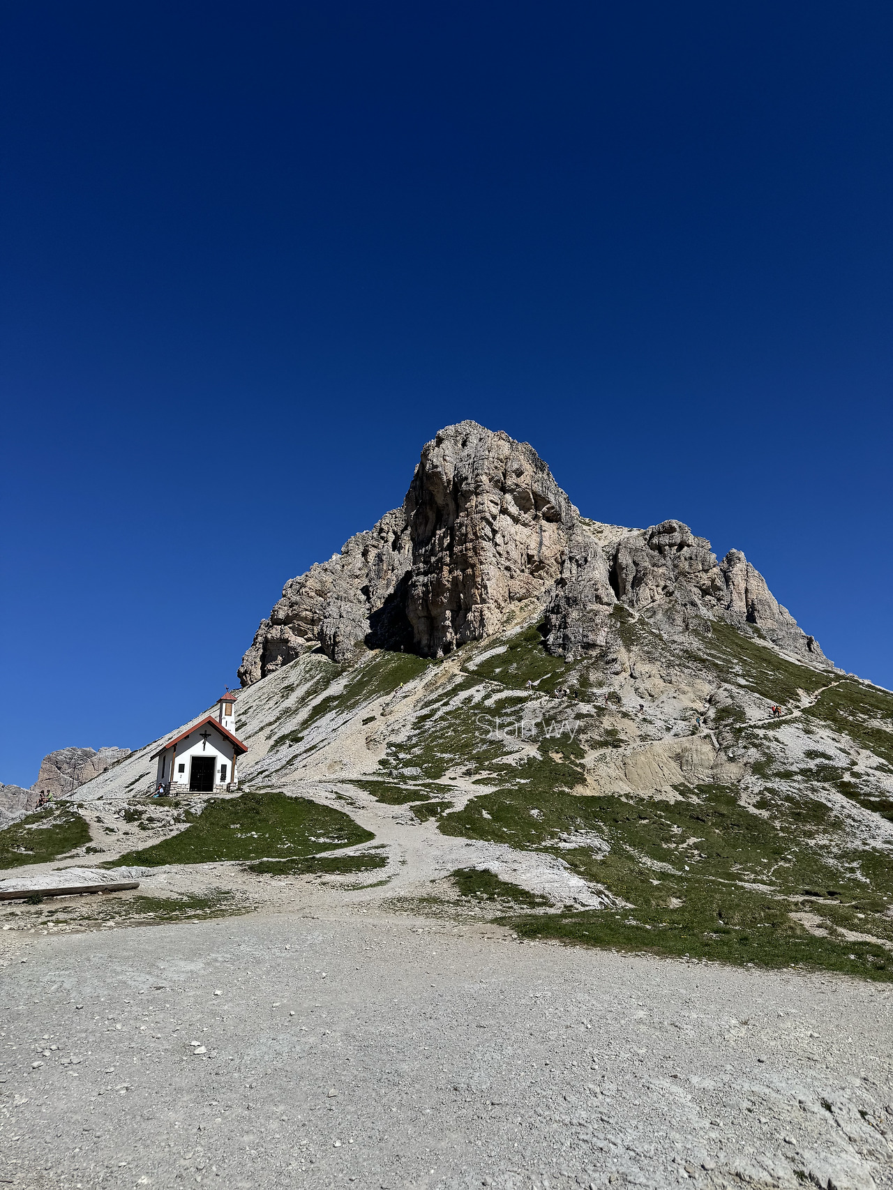 저 앞에 작은 예배당 하나가 보인다. 데글리 알피니 예배당(Cappella degli Alpini)이라고 하는데, 제1차 세계대전 당시 오스트리아-이탈리아 간 전투에서 사망한 병사들을 추모하기 위해 세웠다고 한다. 그리고 산악인들의 안녕을 기원하는 의미도 있다고. 뒷편으로는 묘비 몇 개가 있다. 잠시 묵념.