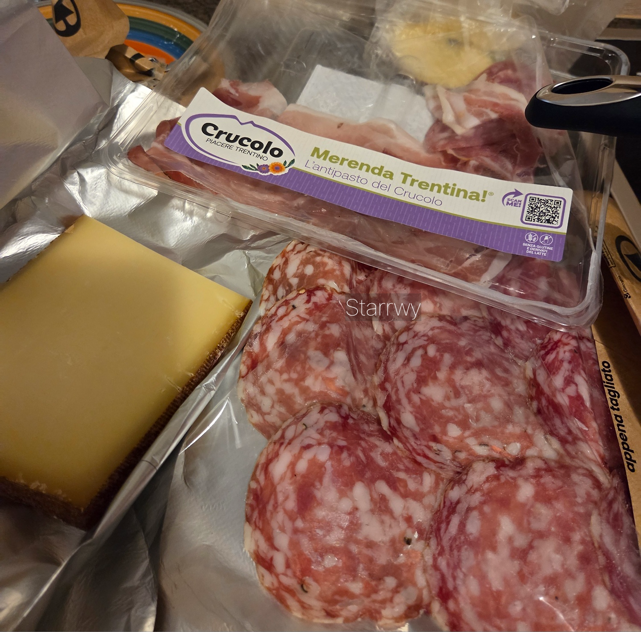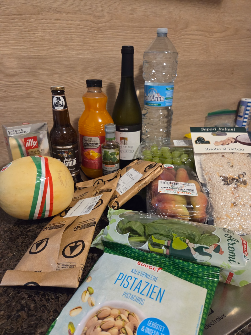 토마토와 채소, 저녁에 먹을 빵도 손수 잘라 봉투에 담았다. 와인에 곁들일 멜론, 납작복숭아, 청포도, 피스타치오, 바질도 장바구니 in! 살라미와 치즈는 점원의 추천을 받아 최소 그램으로 잘라왔다. 사진을 못 찍은 게 너무 아쉬운, 기계를 통해 아주 얇게 잘리는 살라미..! 치즈는 부드러운 것과 단단한 것 중 단단한 종류로 골랐는데, 어떤 맛일지 궁금하다. 와인은 베네치아에서 맛있게 먹었던 피노 그리지오를 한 병 담고, 트러플 리조또를 만들 수 있는 키트가 있어 궁금해서 같이 담았다. 끝으로 내일 아침에 먹을 커피 캡슐과 물, 주스까지 넣으니 가져온 장바구니가 꽉찼다. 오늘 저녁이 너무 기대된다.