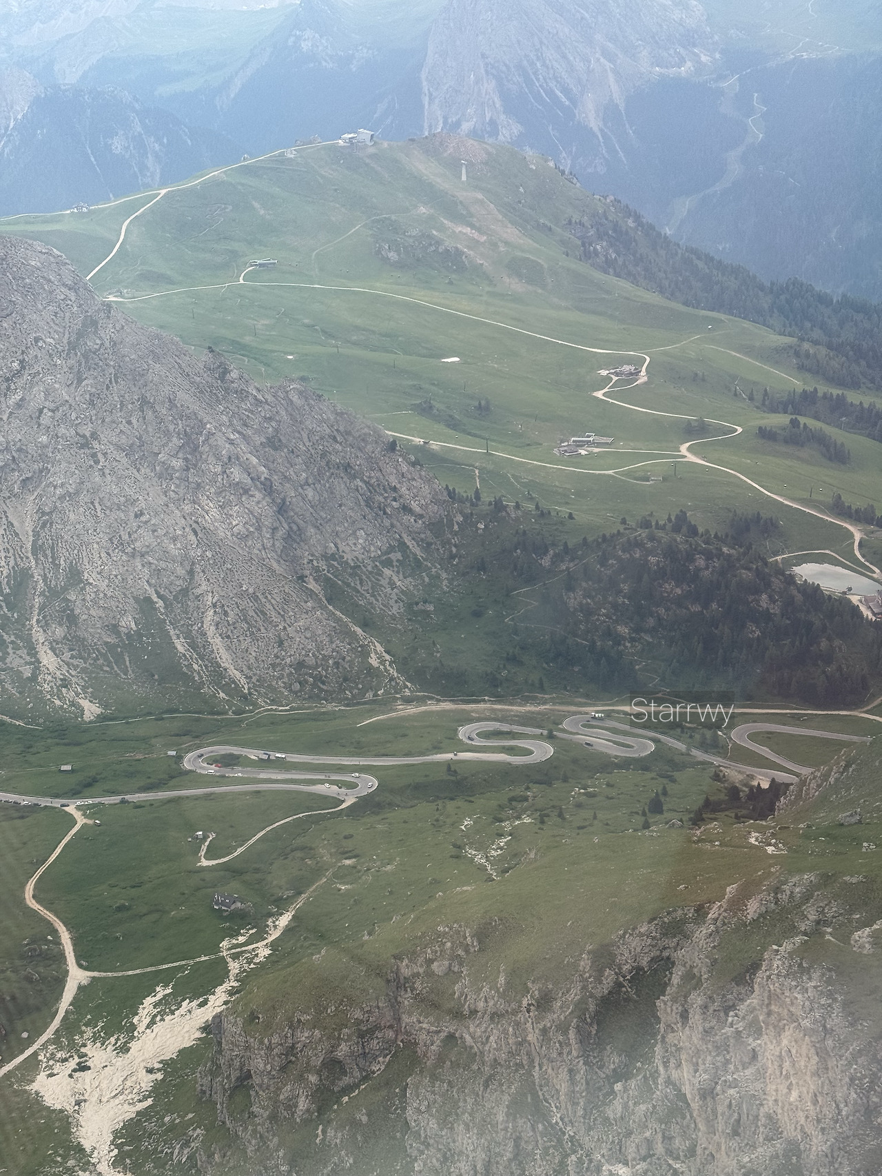 돌로미티 여행 3일차. 다음 행선지는 사쓰 포르도이(Sass Pordoi). 사쏘 룽고에서 1시간 정도 걸린다. 정말 말도 안 되게 꼬불꼬불한 길을 운전했다. 1.5차선 같이 좁은 길을 우리도 가고, 오토바이 부대도 가고, 자전거 부대도 가고, 캠핑카도 지나간다.