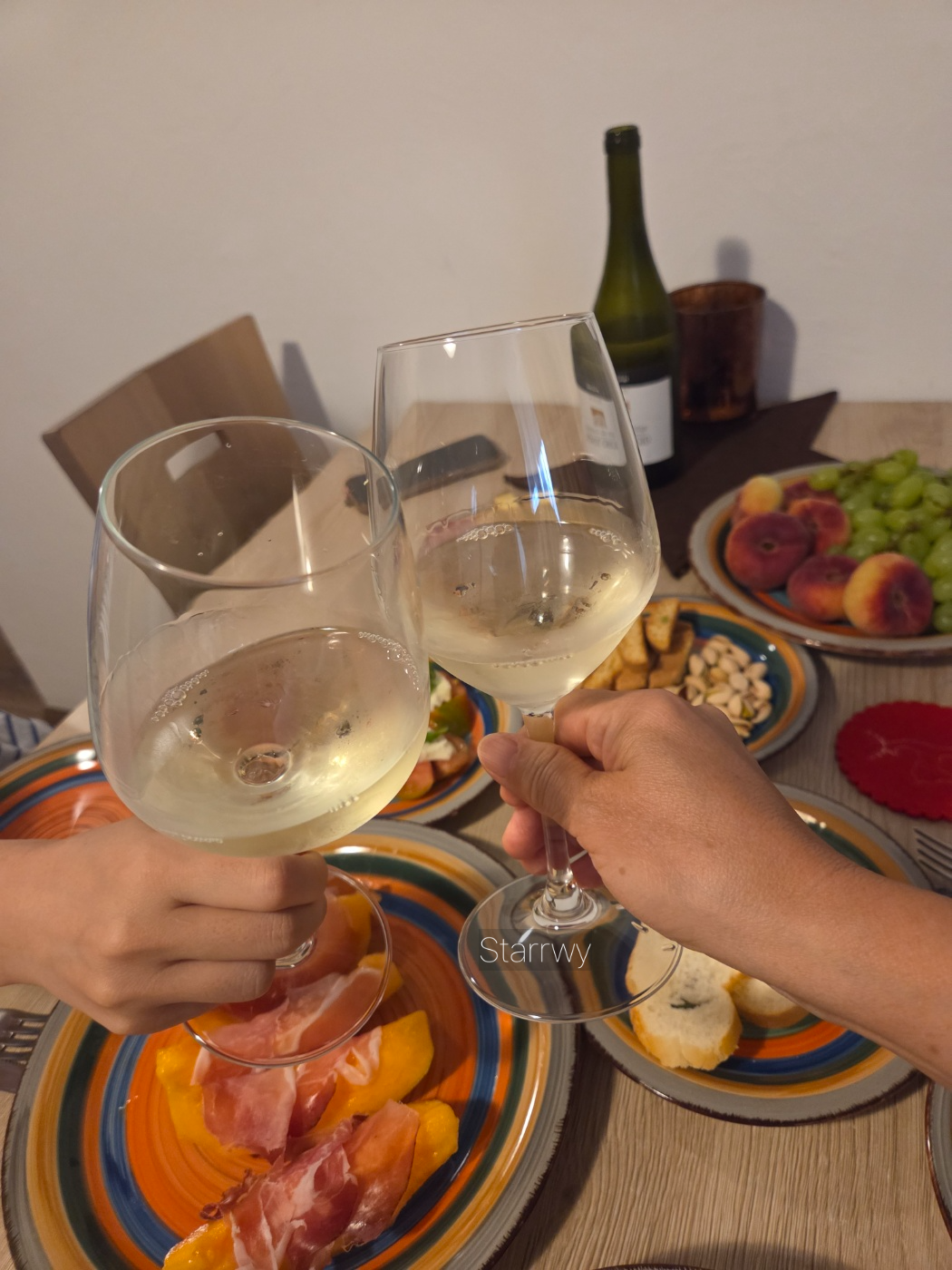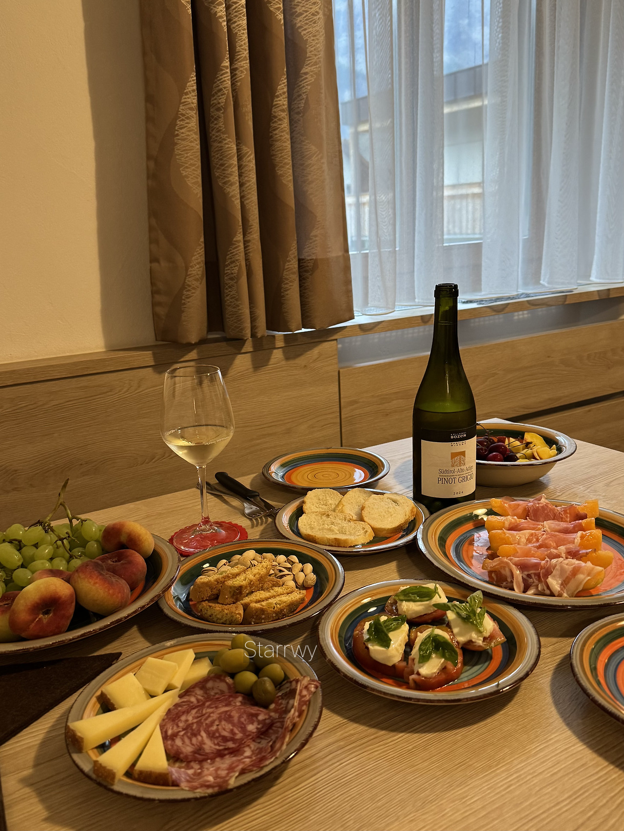 오늘의 저녁 식사는 엄마가 준비해주시기로 했다. 피노 그리지오가 메인인 와인 안주 한 상. 멜론을 잘라 프로슈토로 감고, 토마토에 모짜렐라와 바질, 올리브유를 올렸다. 아까 사온 빵과 치즈, 살라미, 올리브, 피스타치오 등을 곁들이니 먹고 싶은 것들이 전부 준비되어 아주 훌륭하다.