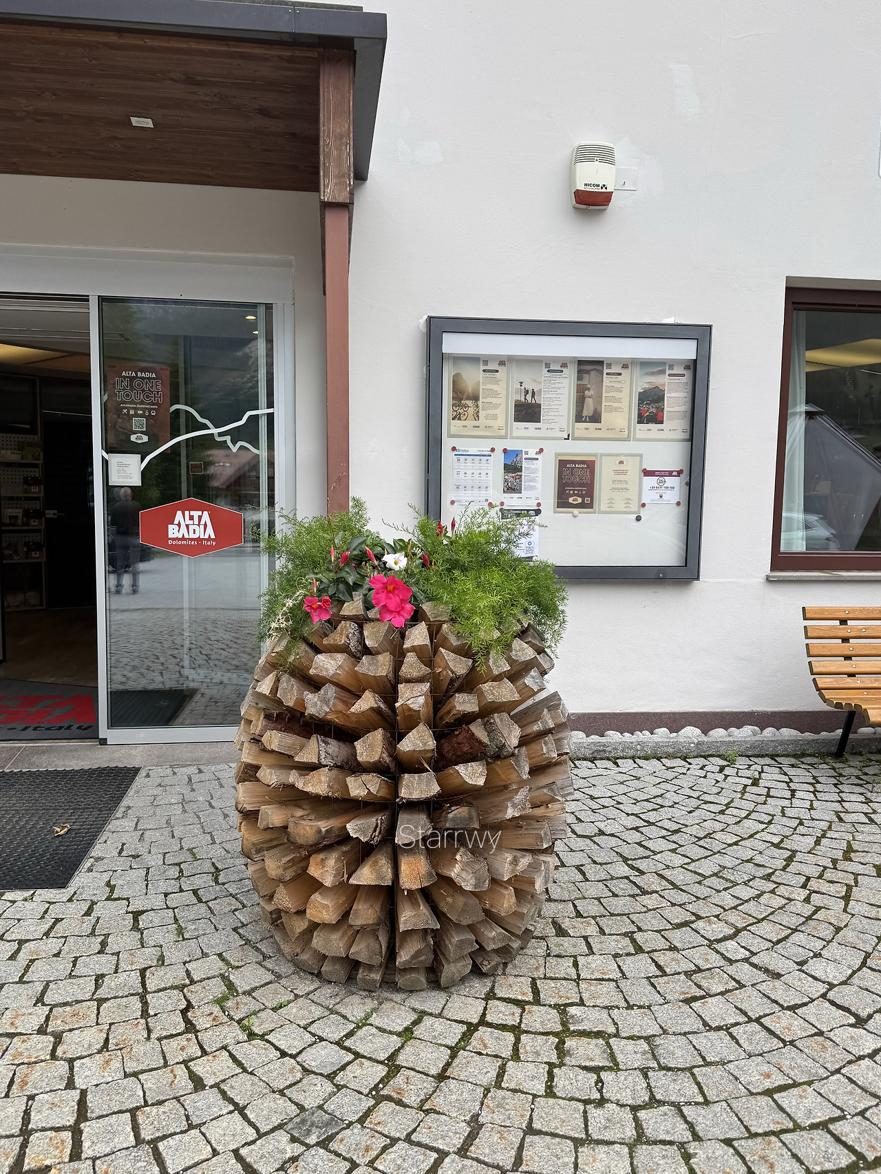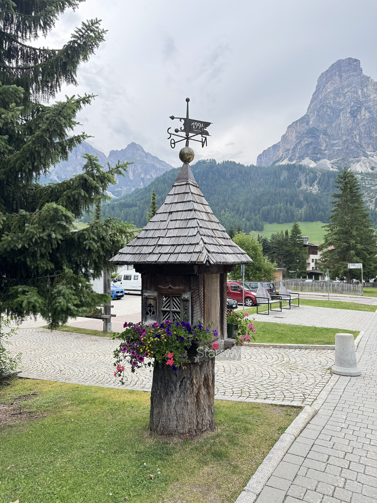 집으로 돌아오는 길에 스친 코르바라(Corvara) 시내가 궁금하여 잠시 둘러보고 오기로 했다. 숙소에서 차로 거의 5분 거리의 소도시인데, 작은 부티끄들이 곳곳에 있어 구경하기 좋을 것 같았다. 한국에 돌아가는 날이 아버지 생신이라 선물을 골라볼 수 있겠다는 기대도 되었다. 방문센터 앞에 주차를 한 뒤 상점가로 걸어가니, 비가 조금씩 흩뿌린다. 숙소에서 가져온 장우산을 나눠쓰고 돌아다니며 옷가게와 소품샵 등을 구경했다.