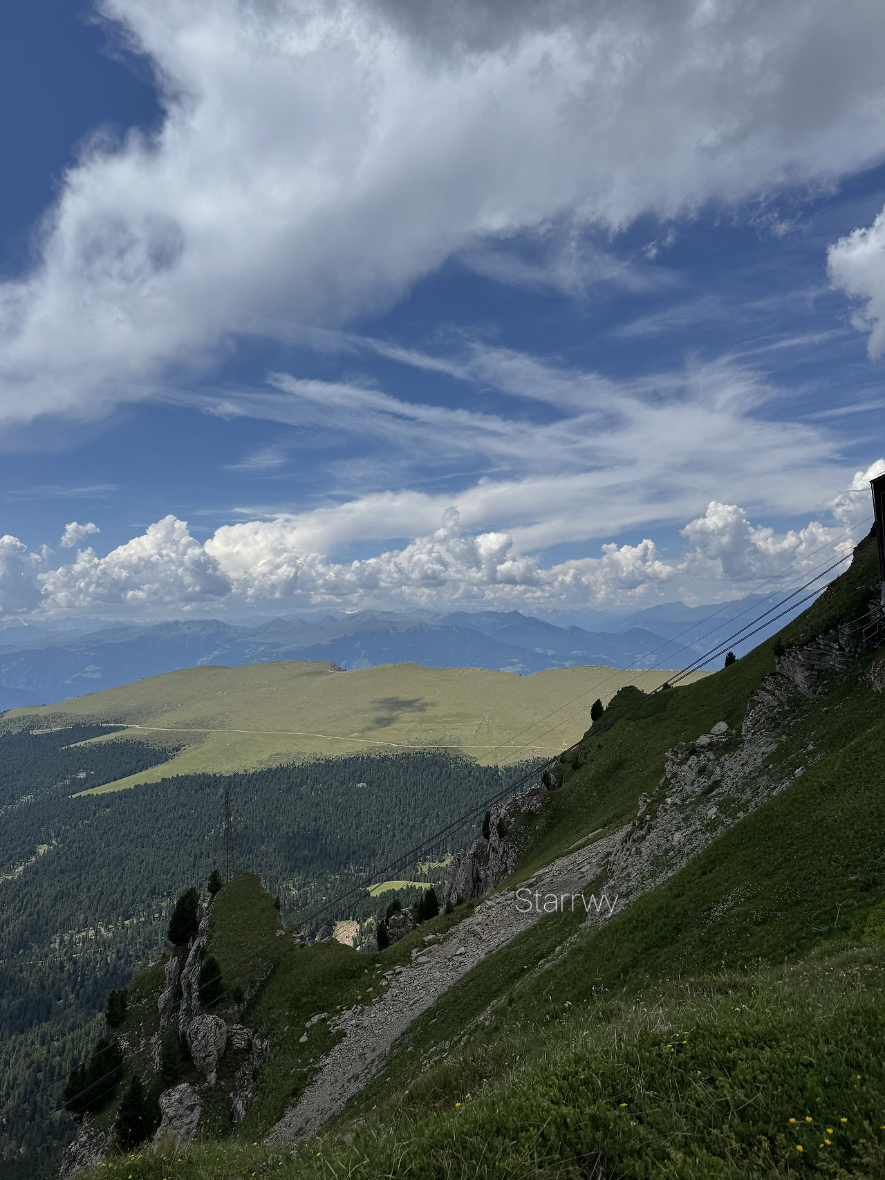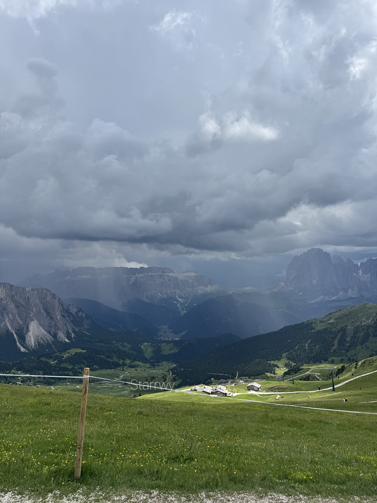 케이블카 플랫폼 바깥으로 나오니 돌로미티의 전형적이면서도 비현실적인 풍경에 말 그대로 숨이 탁 트인다. 바위산이 뾰족한 북쪽에서는 먹구름 사이로 번개가 번쩍거리고, 천둥 소리가 계속 들린다. 우리가 서 있는 곳에 비가 내리지는 않지만 이따금 하늘이 갈라지는 듯한 소리가 지척에서 크게 들리니, 이러다가 벼락을 맞는 게 아닌가 싶다. 저 멀리 빛의 기둥인지, 빗줄기인지 분간이 안 되는 구간이 군데 군데 보인다. 그 옆으로 거대한 칼날을 펼쳐놓은 듯 뾰족한 봉우리가 하늘을 향해 수직으로 솟아있는 절벽과 암봉들을 보고 있자니, 이게 대체 어떻게 만들어졌을지, 어떻게 이 곳에 위치하고 있는 걸지 궁금해졌다.