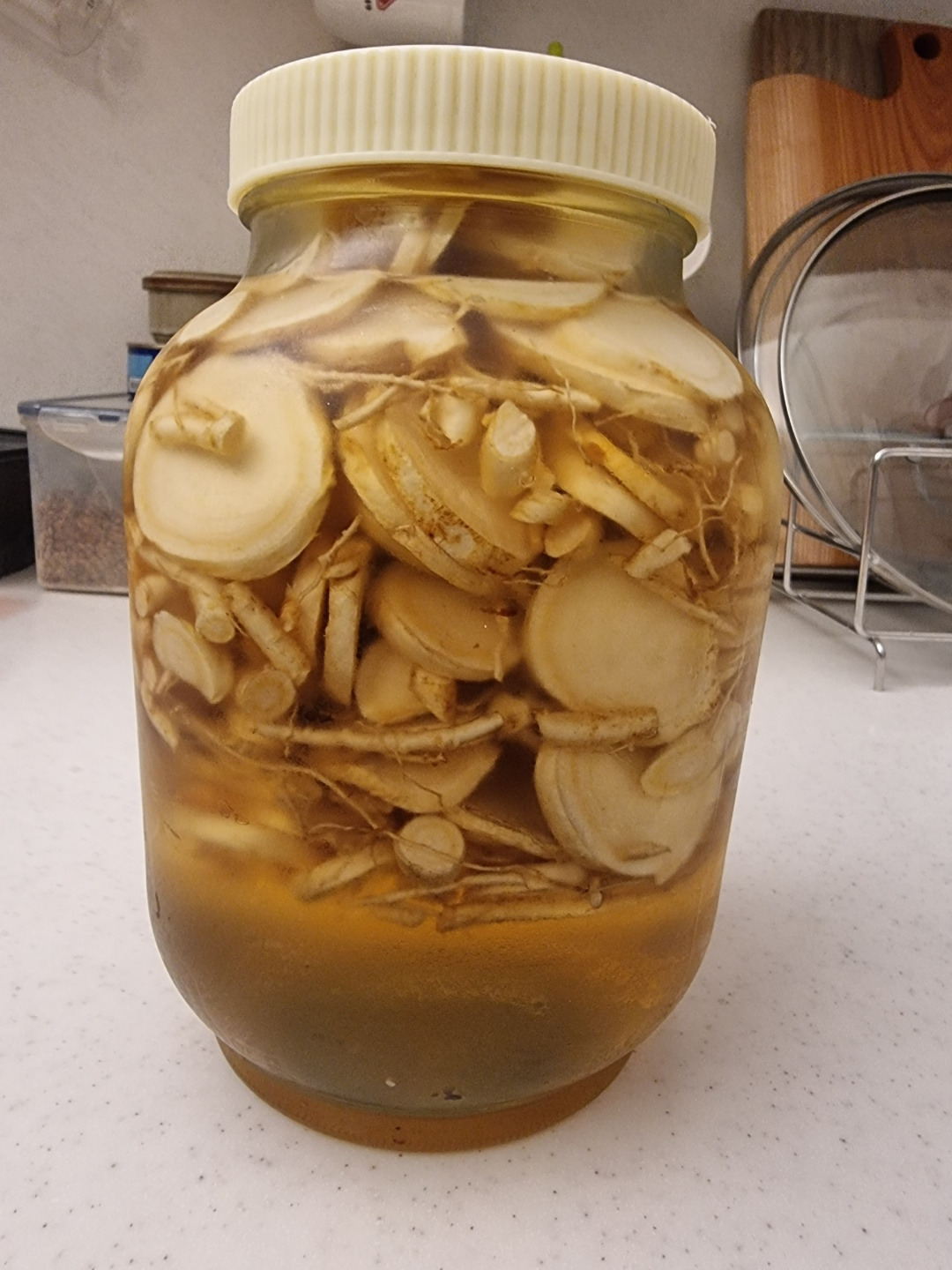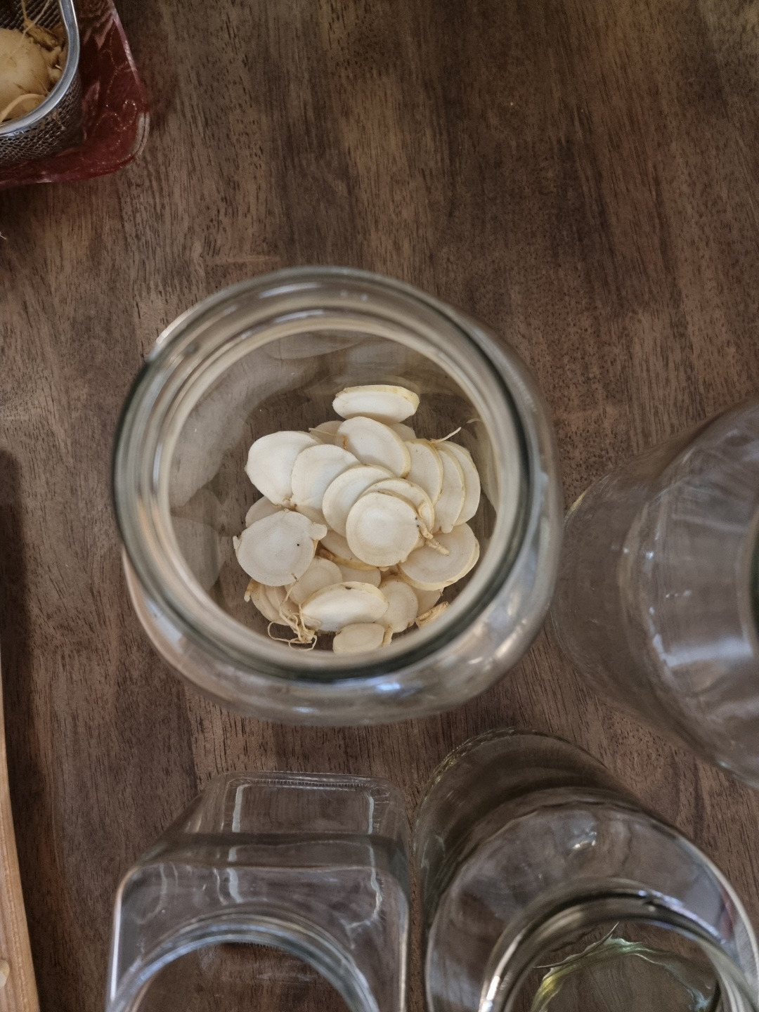 인삼 조각이 반 정도 찬 병에 꿀을 한가득 채워 넣었다. 이제는 인삼이 재워지는 시간이다.