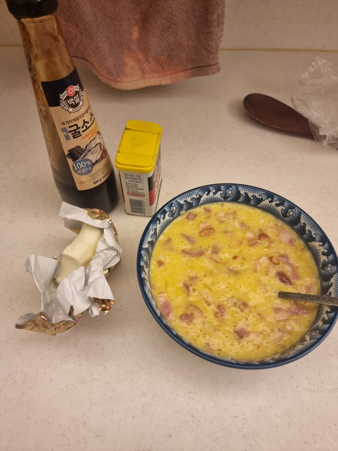 달걀이 다 익었다 싶으면 버터를 한 숟가락 떠 넣는다. 다시 주걱으로 볶는다. 버터 덩어리가 사라지면 굴소스 한 숟가락을 넣는다. 다시 볶는다. 굴소스가 골고루 밥 전체에 퍼지고 난 다음, 후추를 넣고 볶으면 끝!